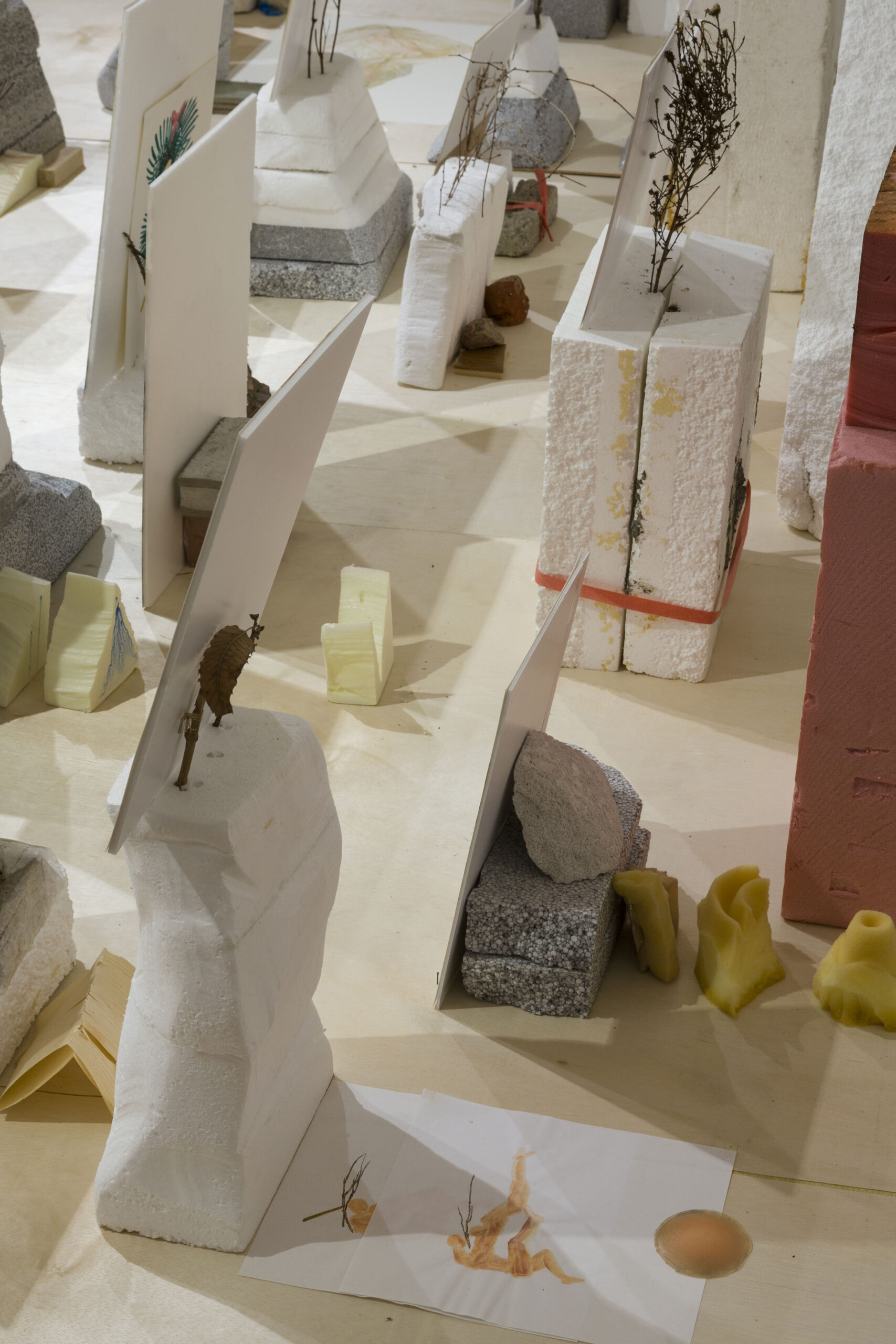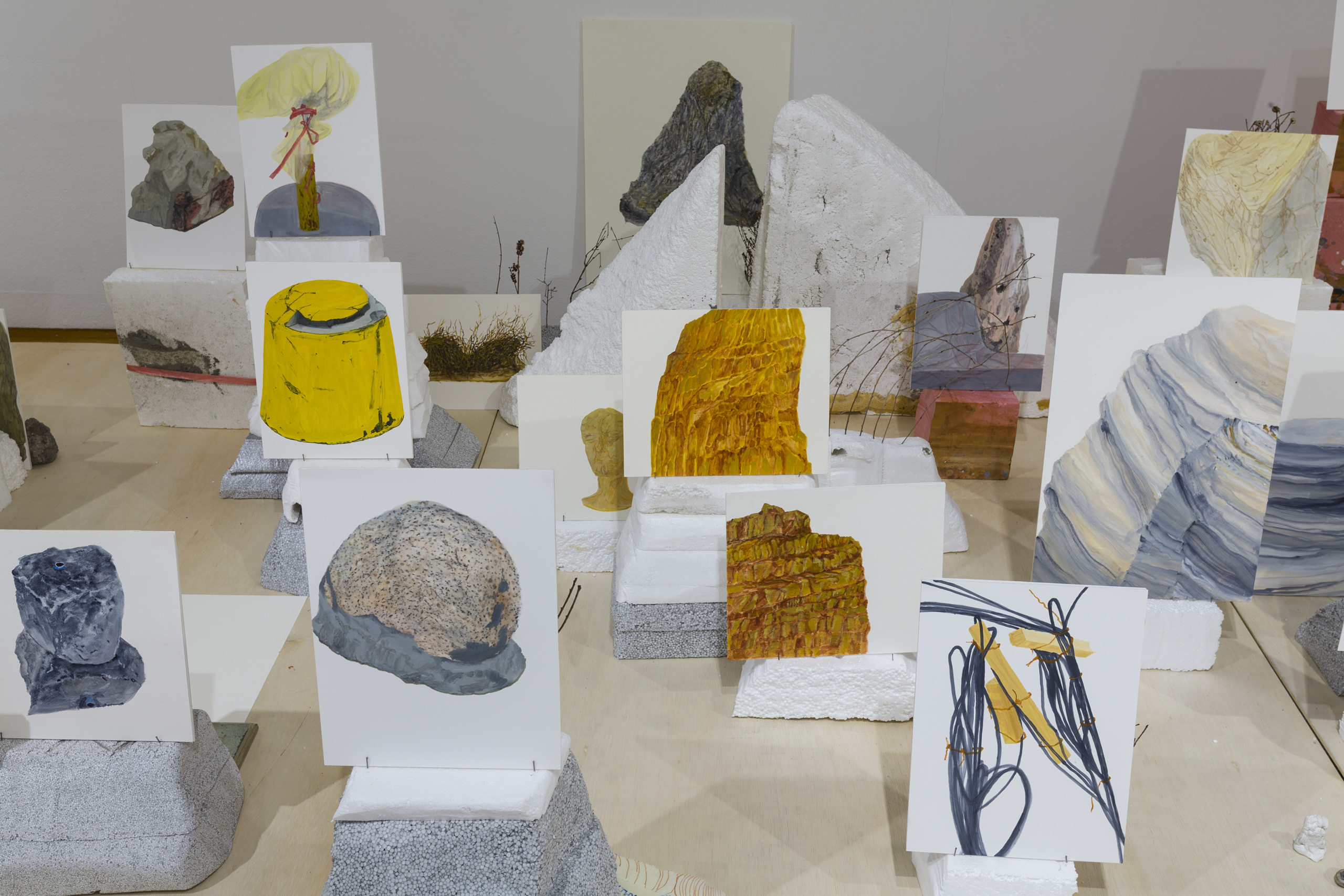 금호미술관 단체전 «B컷 드로잉»(2017)에서 선보인 이해민선 작가의 ‹무생물 주어›, 2014-2017, 종이 위에 오일 페인팅, 스티로폼, 나뭇가지, 나무 토막, 유토 등, 가변 설치