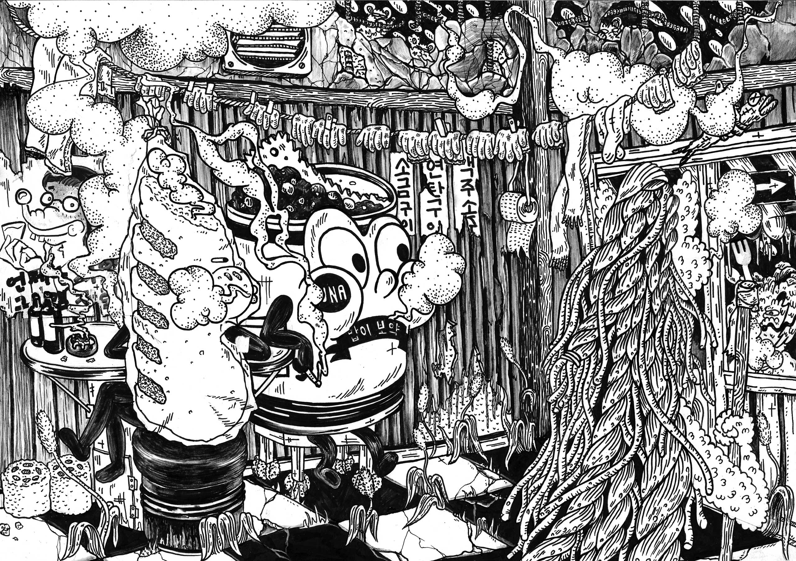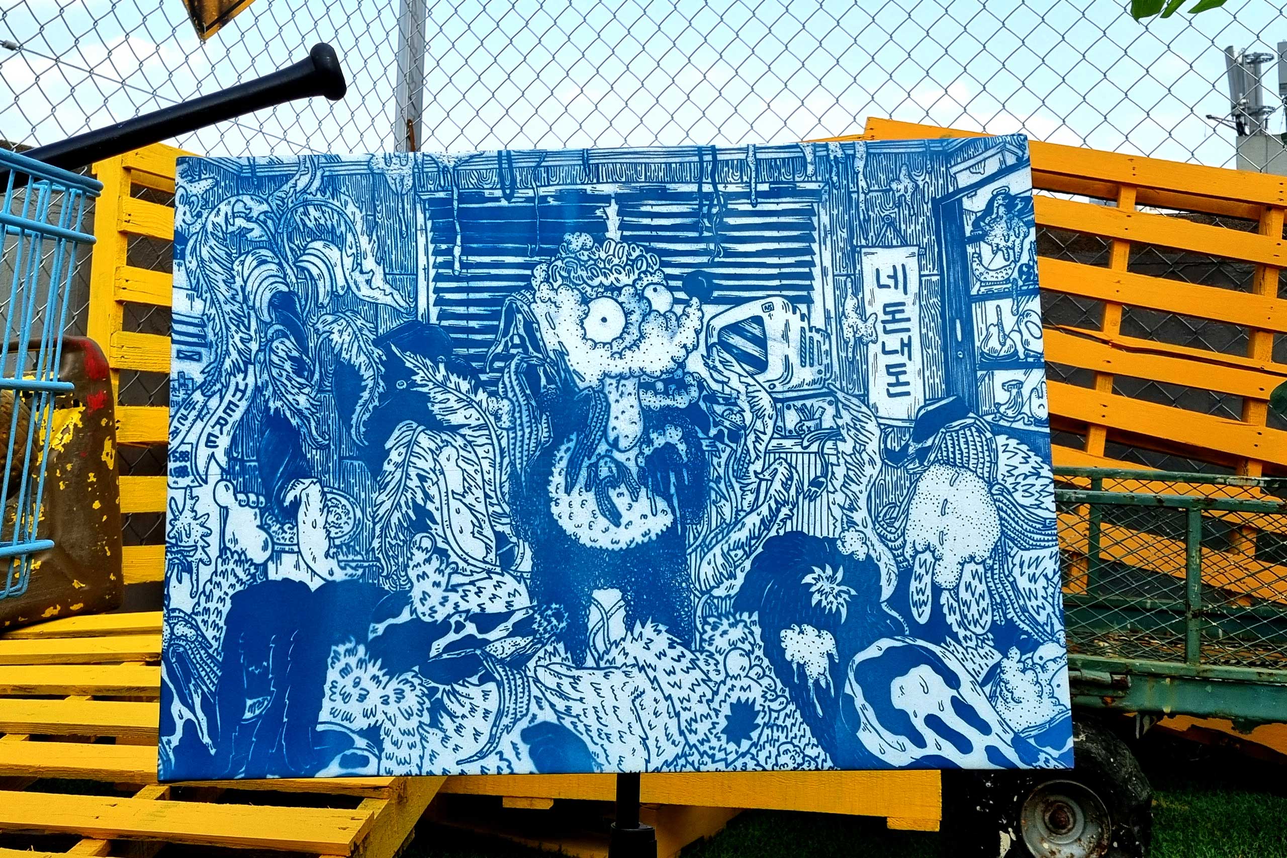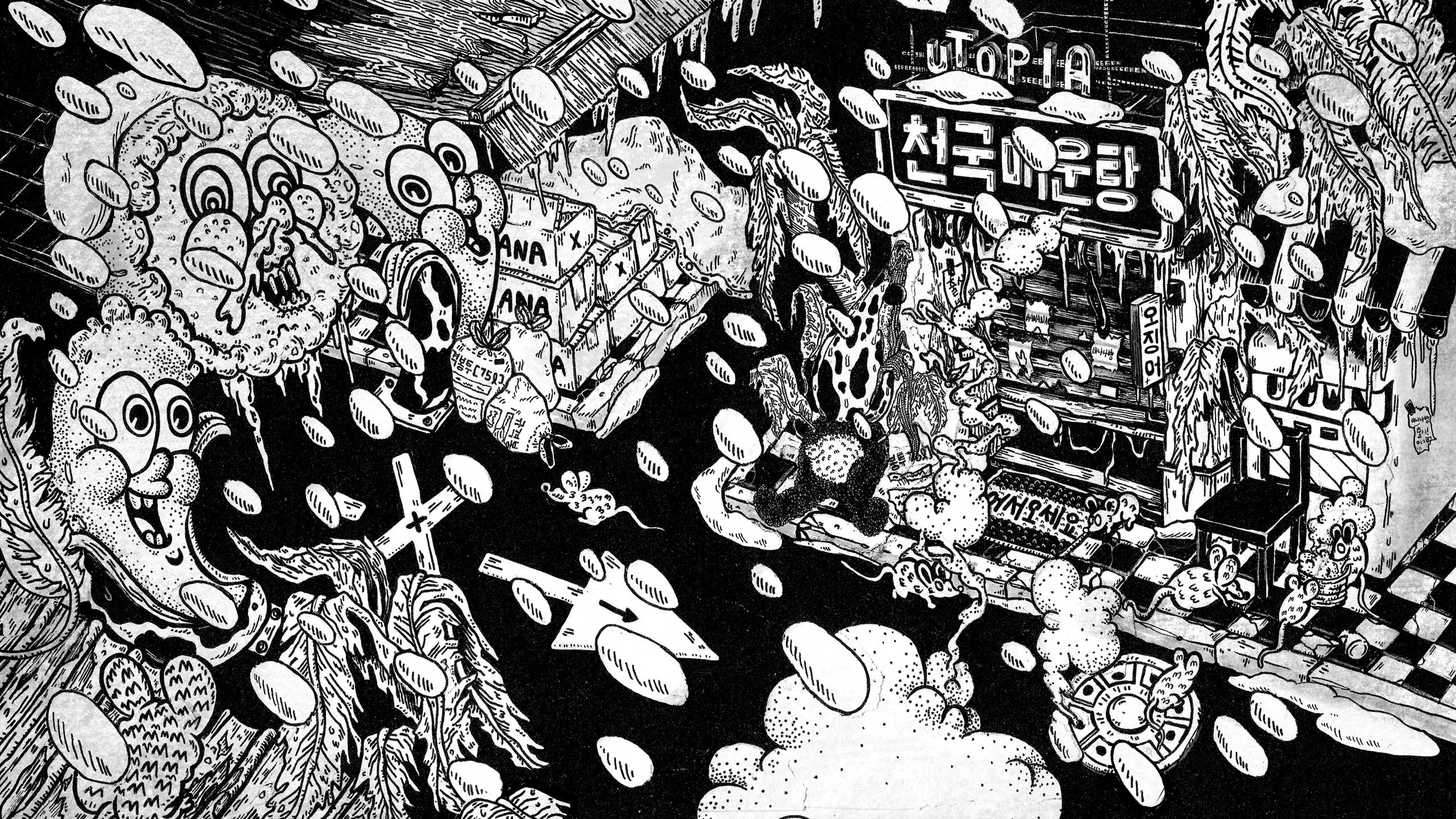 ‘바나나 빵’, ‘쥐’, ‘벌름벌름’, ‘두더지’, ‘플라시보’, ‘분자 이동’ 등 방송에서 선보인 일상 속 사건으로 만든 제 커뮤니티의 MEME들이 현실과 가상의 경계를 넘나들며 새로운 형태의 좀비 세계관을 구성하는 이번 작업의 키워드가 되었어요. 그래서 좀비 사태에 직면한 우리의 일상을 소재로 ‘열대 광기(Tropical madness)’라는 타이틀의 세계관을 만드는 중입니다. 처음에는 농담으로 ‘만약 좀비 사태가 실제로 일어난다면 원정대를 꾸릴 건데 팀에 합류할 의사가 확실히 있는 사람’이 있는지 투표를 진행했는데요. 15명이 정말 그렇게 하겠다고 하더라고요. 그래서 추첨된 시청자에게 배역을 주고 마치 자신의 스토리의 등장 인물이 된 것처럼 상상하며 인터뷰를 진행해서 캐릭터를 그렸어요. 그렇게 열대 광기의 스토리를 이어갈 등장인물을 구체화시키는 걸 시작으로 서로 마주하게 되는 장면, 좀비 사태로 아수라장이 된 회사, 좀비 바이러스가 퍼트려지는 상황에 대한 스토리를 장면 장면 그려나가는 중이에요. 그림 작업을 진행할 때 스토리를 완전히 완결짓고 시작하지 않았기 때문에 ‘열대광기’라는 이름 아래에 존재하는 각 작품은 시간이나 구성의 순서와 상관없이 산발적으로 흩어진 17개의 영화 장면과도 같아요. 그래서 영화의 OST처럼 각 장면의 테마곡을 만들어 정서의 흐름을 잡고 싶었죠. 국가무형문화재인 남해안별신굿 이수자이자 작곡자인 SAZA(이호윤)와 음악 작업도 함께하는 중이랍니다.