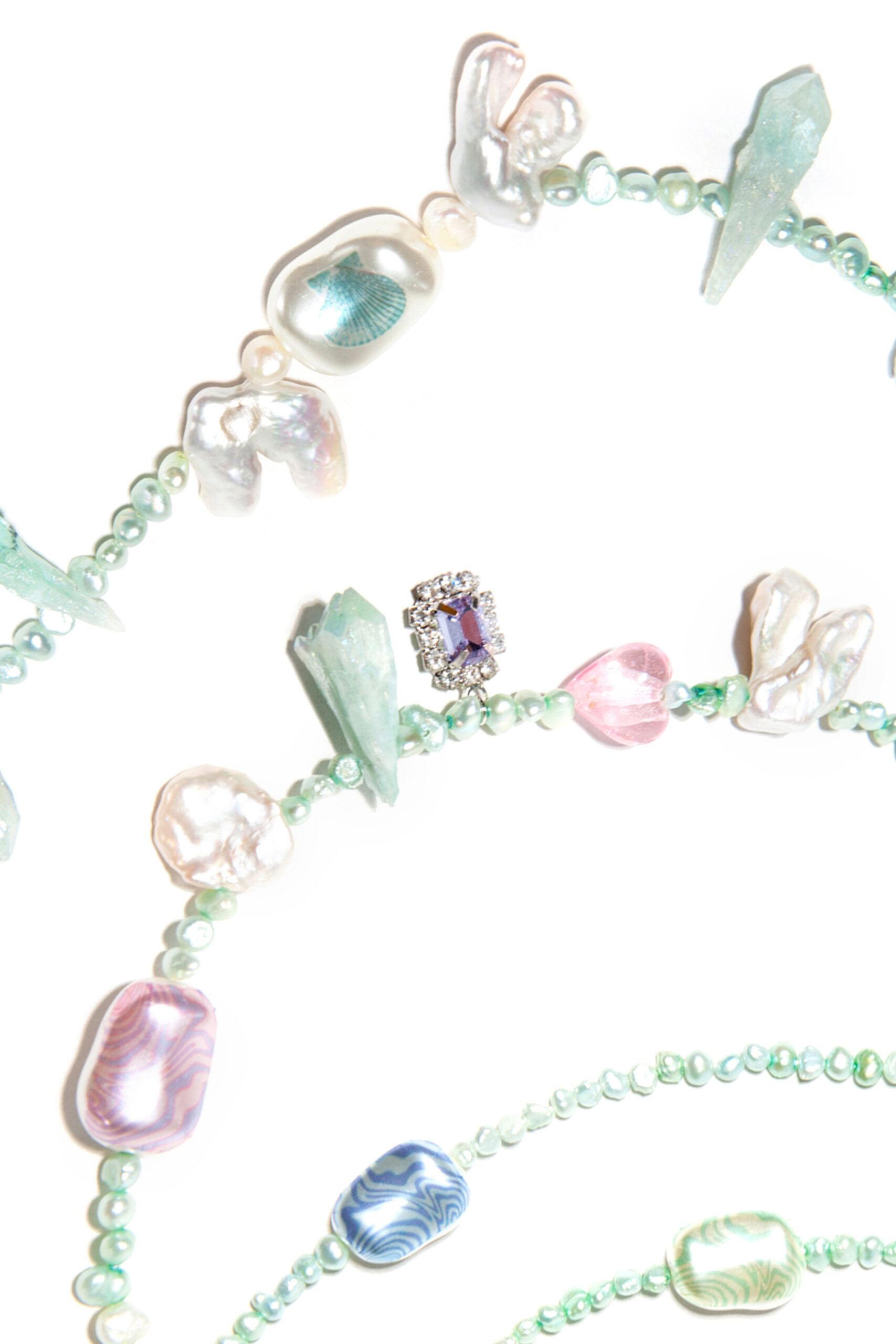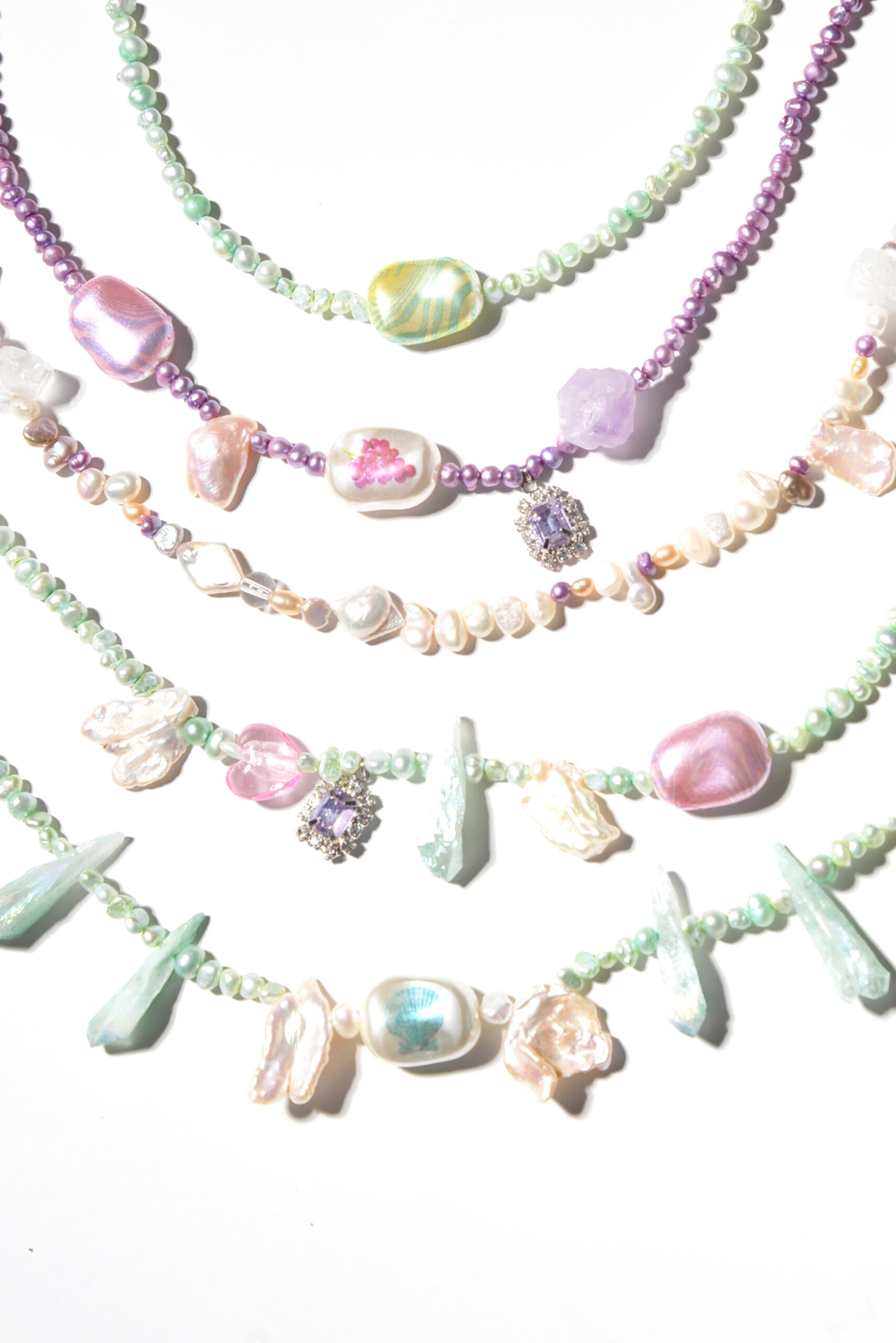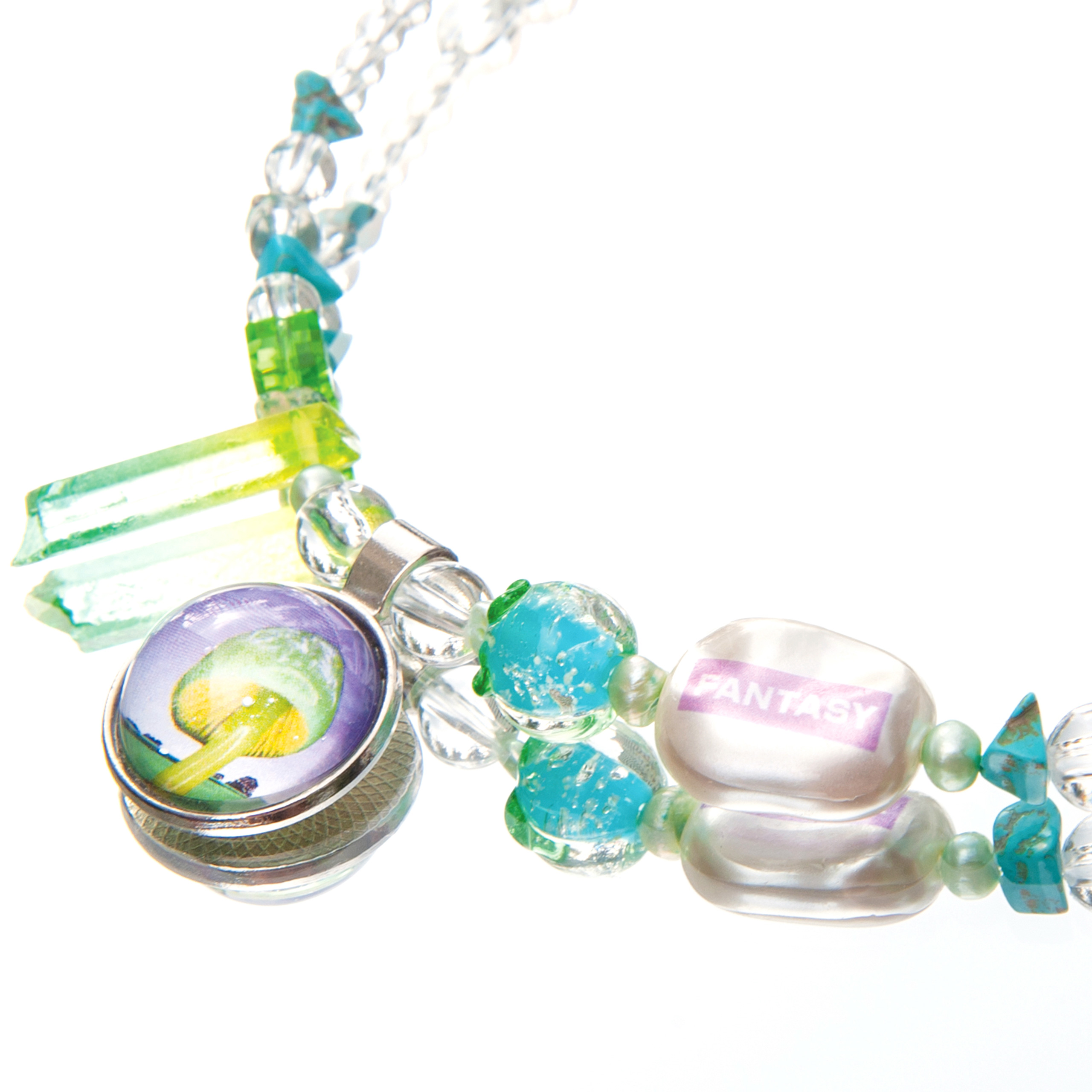 ‘Planet line’은 허깅고트의 유리 돔 팬던트로 구성한 브랜드의 시그너처 작업물이에요. 돔 팬던트를 기준으로 비정형 자재를 불규칙하게 구성해 자유분방한 분위기를 강조했어요. 판타지 느낌의 몽환적인 이미지를 활용하며 허깅고트만의 색을 더했고요. 최근 새로 추가한 ‘Daydream Line’은 진주에 이미지와 텍스트를 입혀 자체 제작한 팬던트로 구성했어요. 좋아하는 컬러 진주를 많이 활용해 개인적으로 만족한 작업물이었죠.