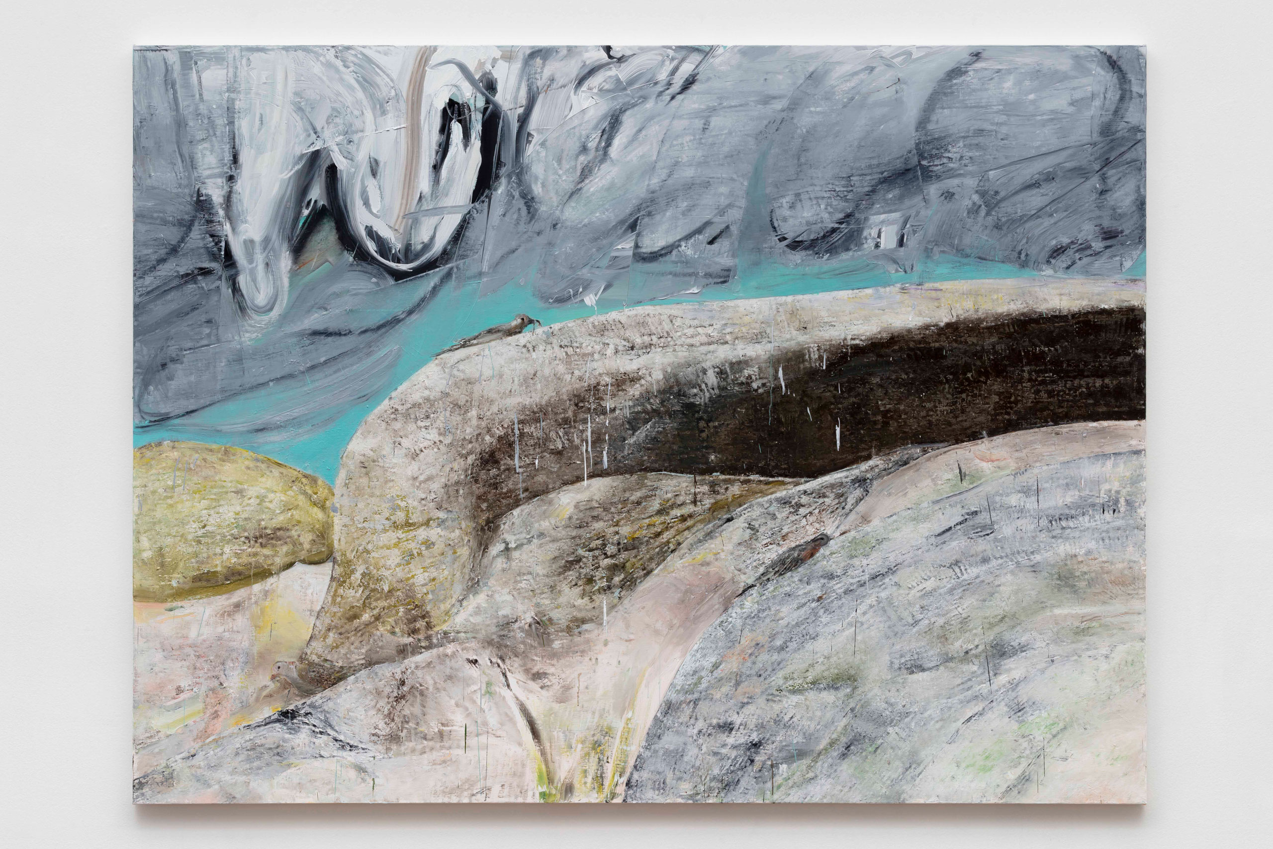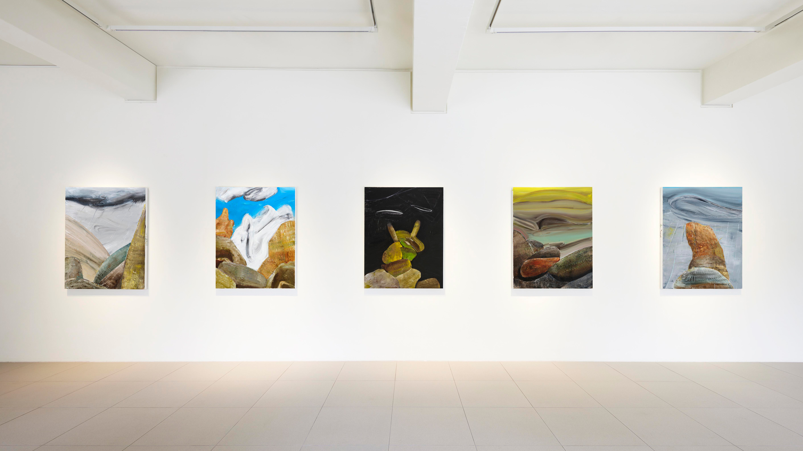 3~4년 전에는 구름을 소재로 작업했어요. 그러다 팬데믹이 오면서 관심사였던 구름이 폭풍으로 변했어요. 폭풍이 밀려올 때 느끼는 걱정과 두려움이 그 당시 상황과 비슷했답니다. 폭풍처럼 거칠게 밀려왔다가 감쪽같이 사라졌으면 하는 바람이 자연스럽게 작업으로 이어진 것 같아요. 전시 «폭풍이 온다»에서는 비구름이 밀려오는 풍경과 메마른 돌산, 텃새 그리고 슬픈 표정의 ‘마리’를 통해 인간의 태생적 불안에 대해 이야기했어요. 최근에는 «야산»이라는 전시를 통해 폭풍을 덤덤하게 받아들이는 다양한 형태의 돌산을 인간의 삶에 빗대어 표현했답니다.