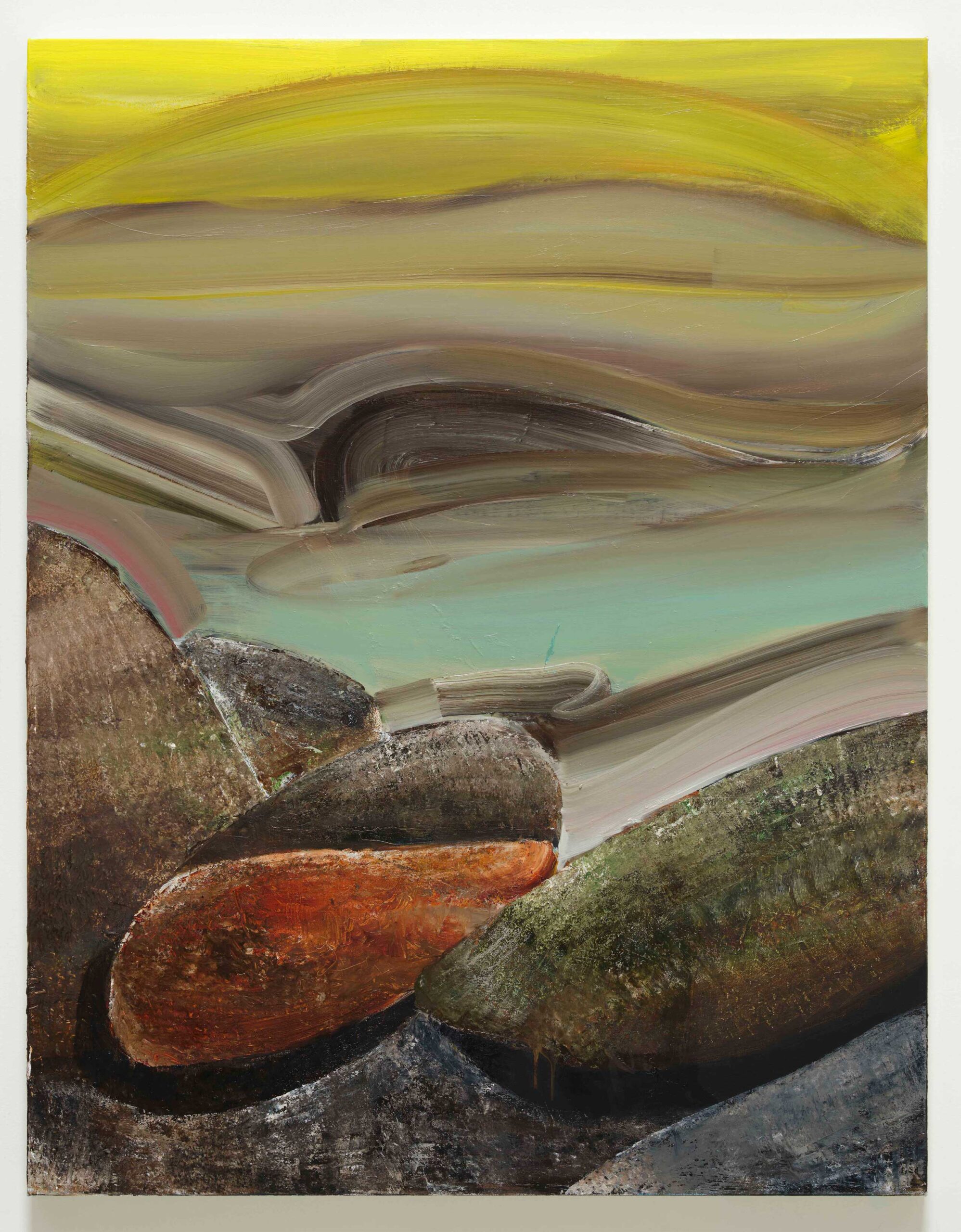 강조라고 말하기엔 좀 그렇고, 고민했던 부분이 있었어요. 바로 그림의 구조였죠. 처음에는 돌산 그림의 구조가 돌산의 사실적인 묘사와 비구름의 직관적 묘사와 서로 부딪히지 않고 한 화면에 균형 있게 표현하려고 노력했어요. 그런데 시간이 지나면서 두 요소 간의 경계가 점점 옅어지고 전반적으로 즉흥적이고 추상적인 표현이 많아지고 있어요. 사실적인 부분 또는 사진으로부터 점점 자유로워지는 것 같아요.