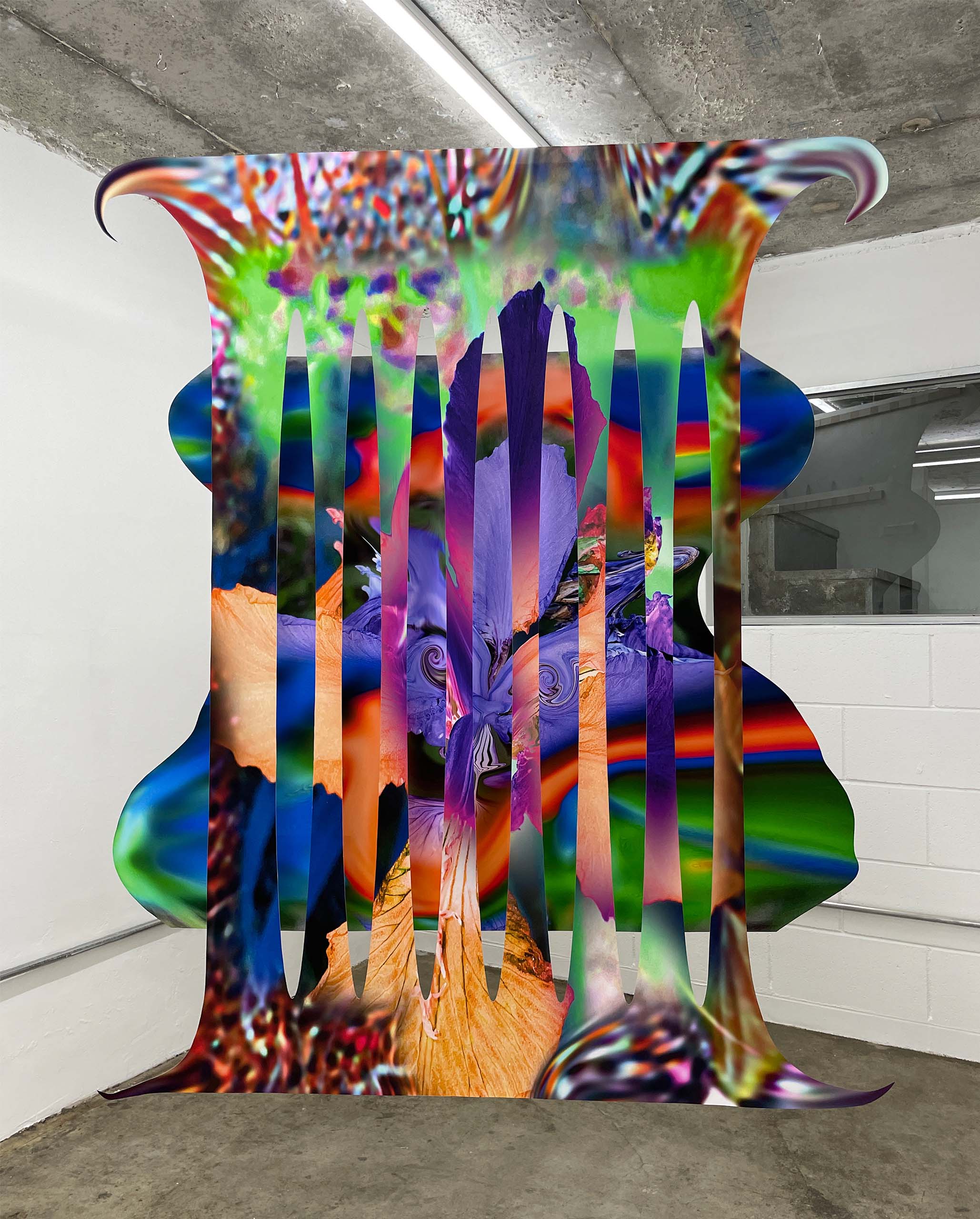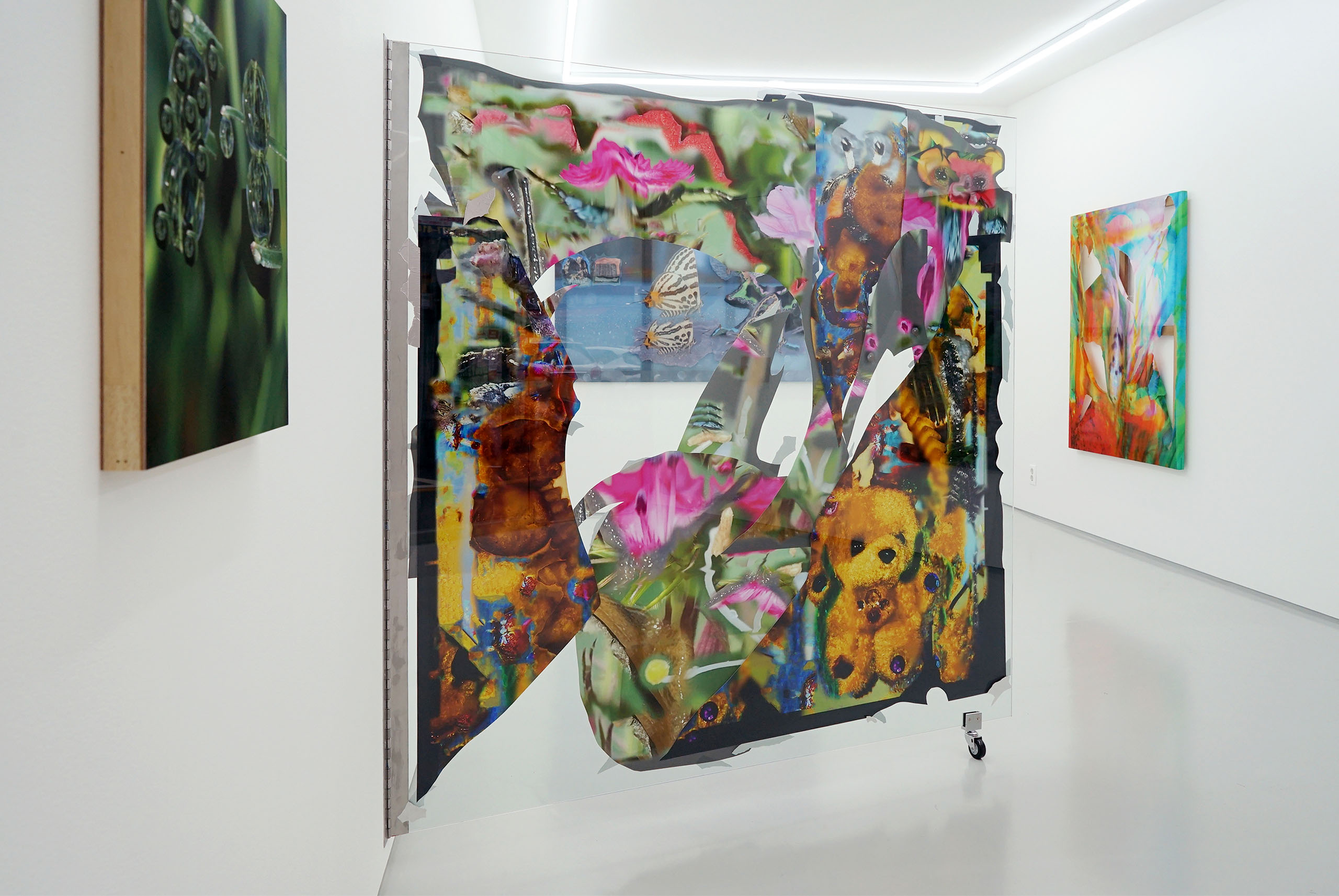 ‹중간지점 불사조›,2021, 아카이벌 피그먼트프린트, 유리, 경첩, 바퀴, 테이프, 200×205×5cm