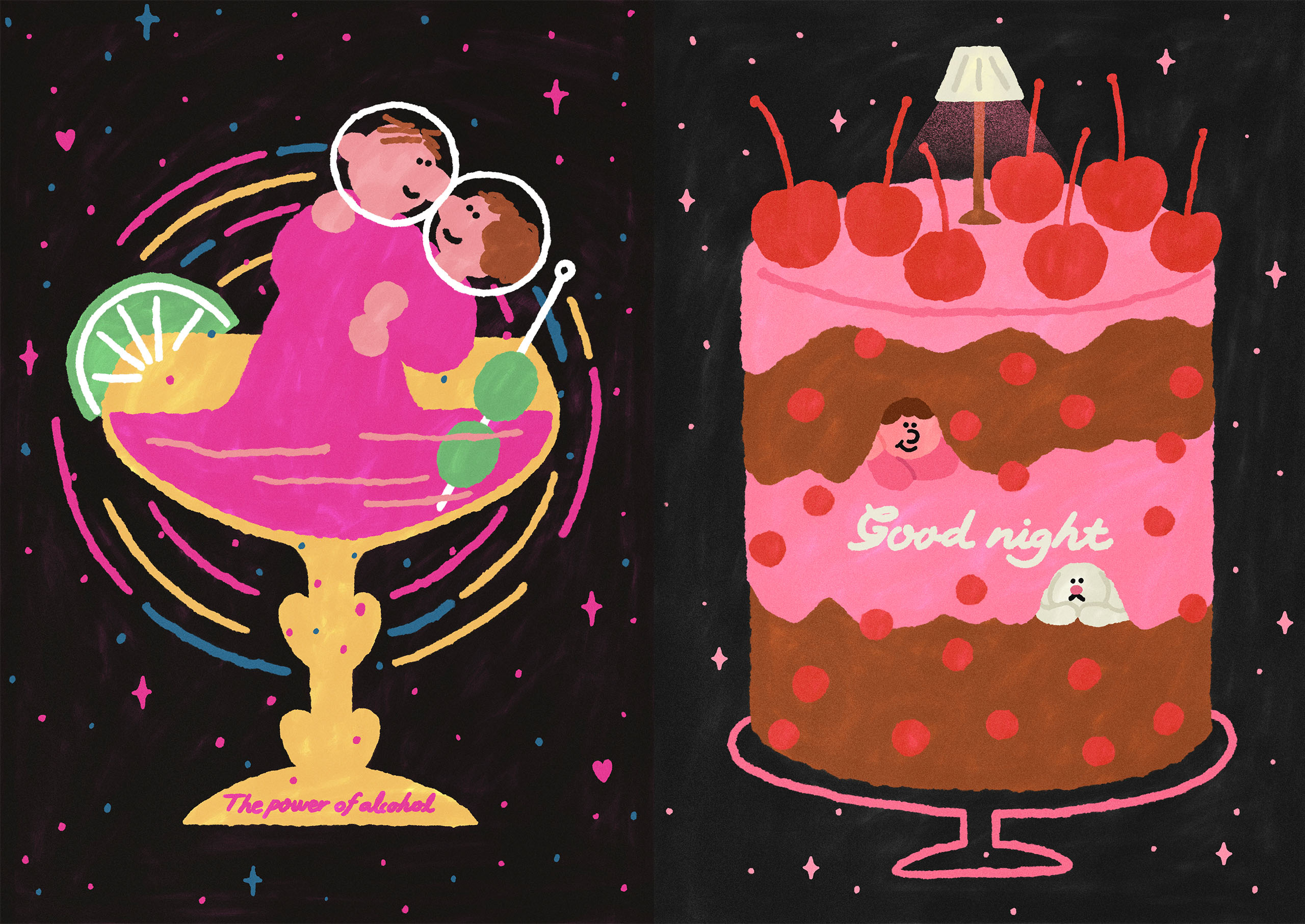 지난 2월 6일부터 3월 14일까지 슈페리어갤러리에서 열린 단체전에 참여하며 여러 작업을 발표했는데요. 저희 집 강아지가 중형견인데 힘이 세서 산책 때 천방지축이에요. 그런 모습을 표현한 그림도 있고요. 술 한 잔에 이루어지는 사랑을 표현한 작업, 저희 집 강아지가 달콤한 꿈을 꿨으면 좋겠다는 생각을 담아 그린 작업도 있답니다.