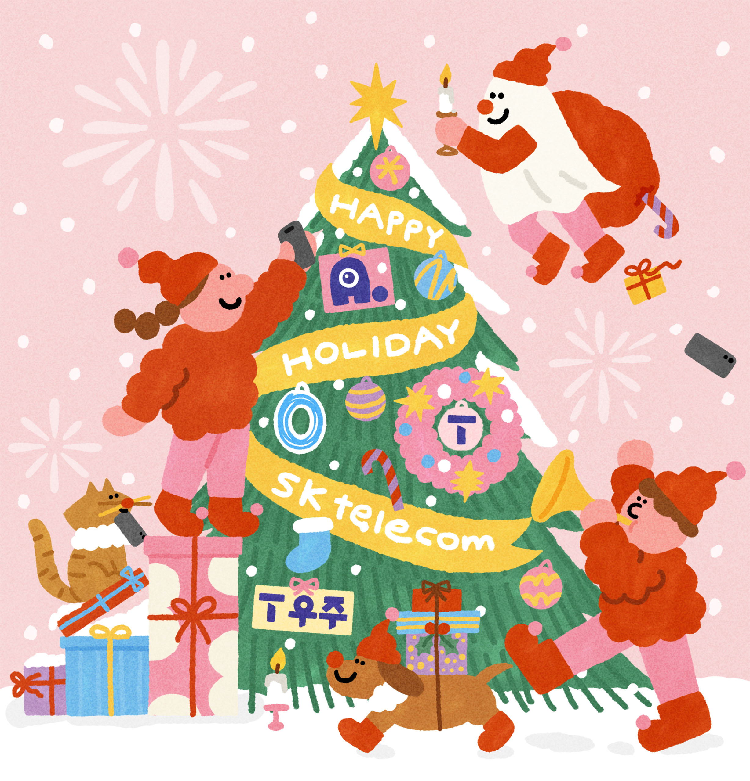연말 연초는 커머셜 작업이 몰리는 시즌이라서 개인 작업을 거의 진행하지 못했답니다. 일러스트레이터로 살아가면서 개인 작업을 하지 못한 것에 대해 반성하게 되지만, 그만큼 정말 눈코 뜰 새 없이 바쁘거든요. 최근 커머셜 작업으로는 지난 연말 SK텔레콤과 협업한 키 비주얼 일러스트레이션이 있어요. 전국 매장에 설치한 터라 인증샷을 많이 받아서 감사했답니다. 개인적으로 소개하고 싶은 작업은 작년 11월에 출판한 그림책 『색상상책 보라, 보라』입니다. 정말 좋은 책인데, 더 많은 분이 보셨으면 좋을 것 같아서 소개하고 싶었어요.