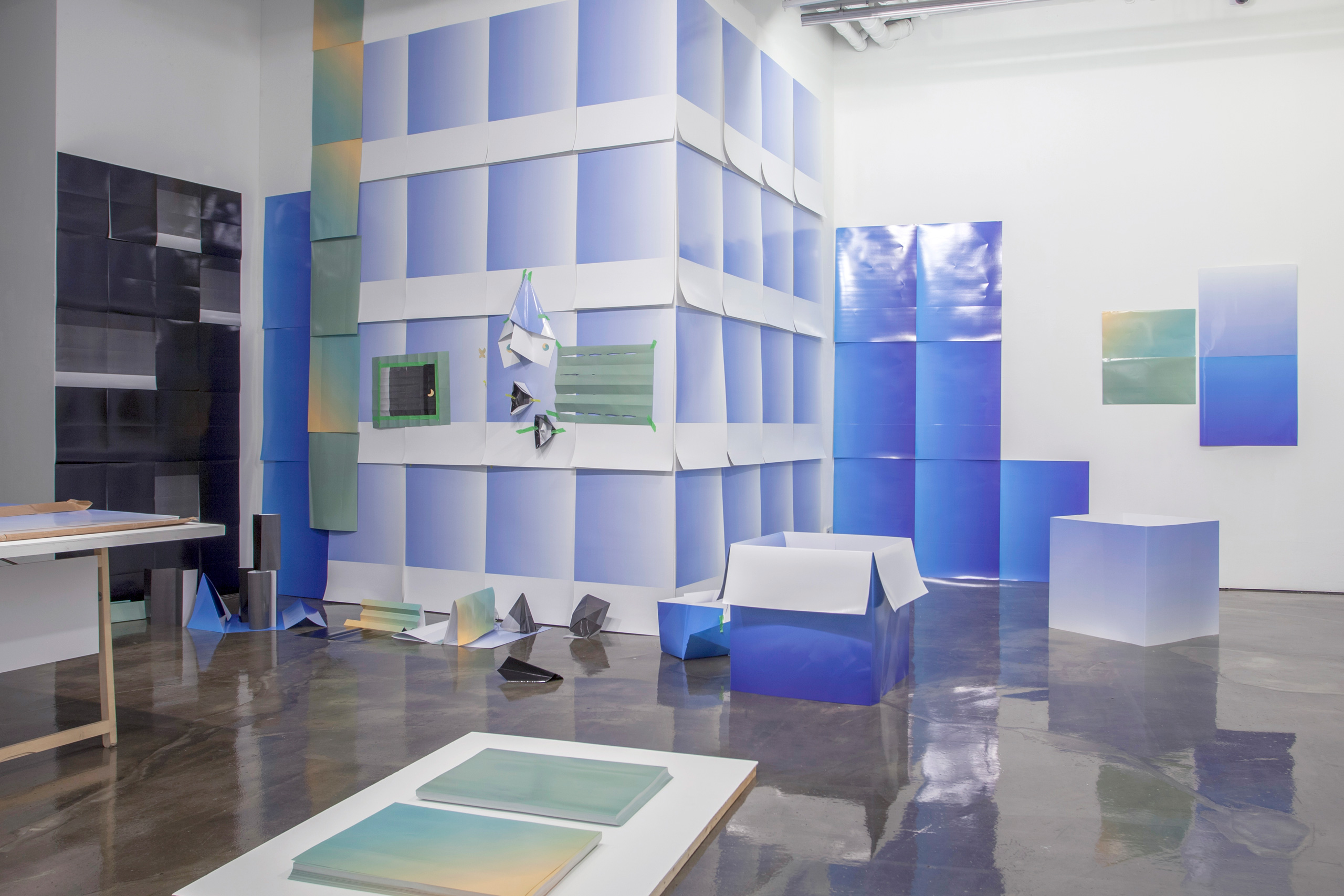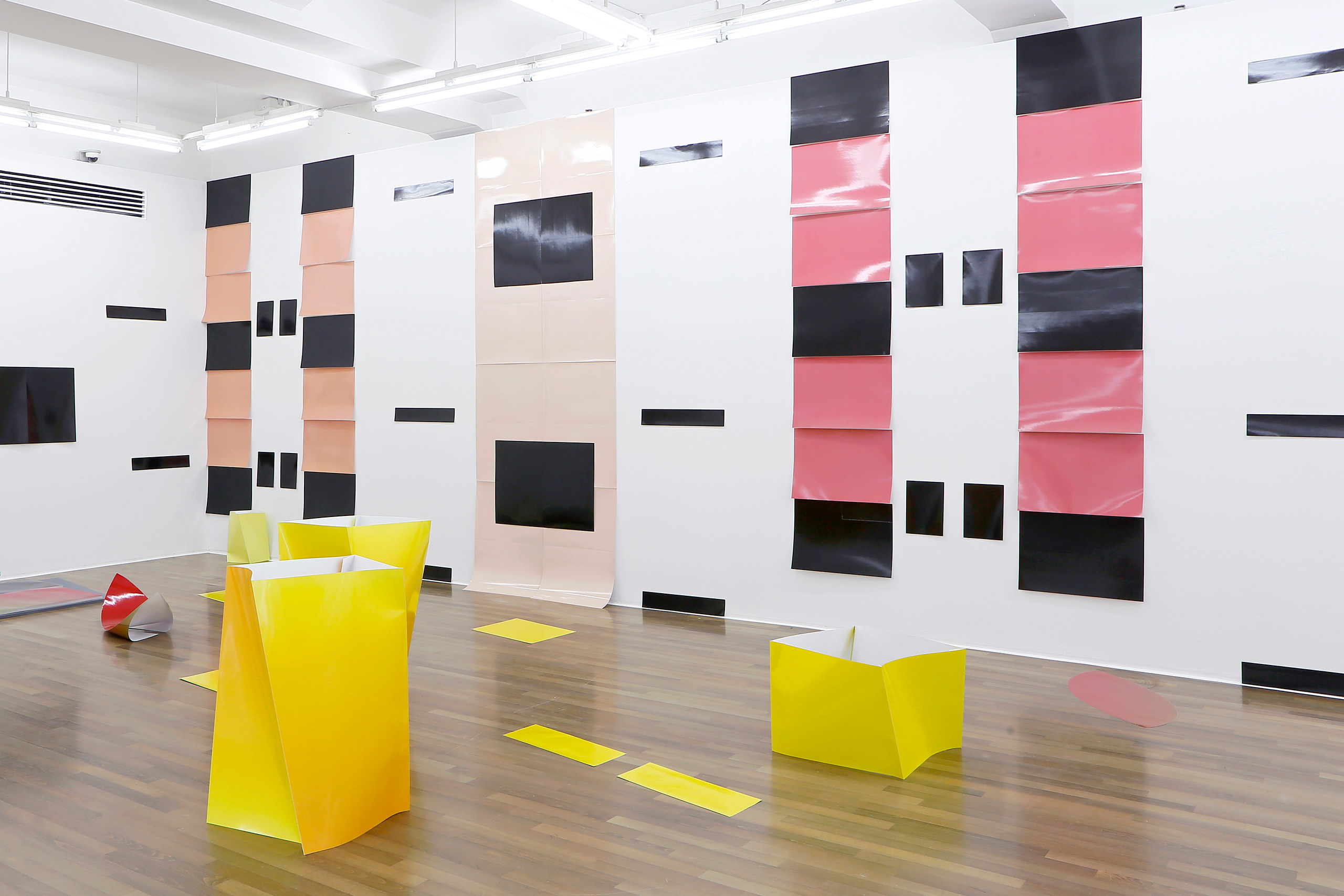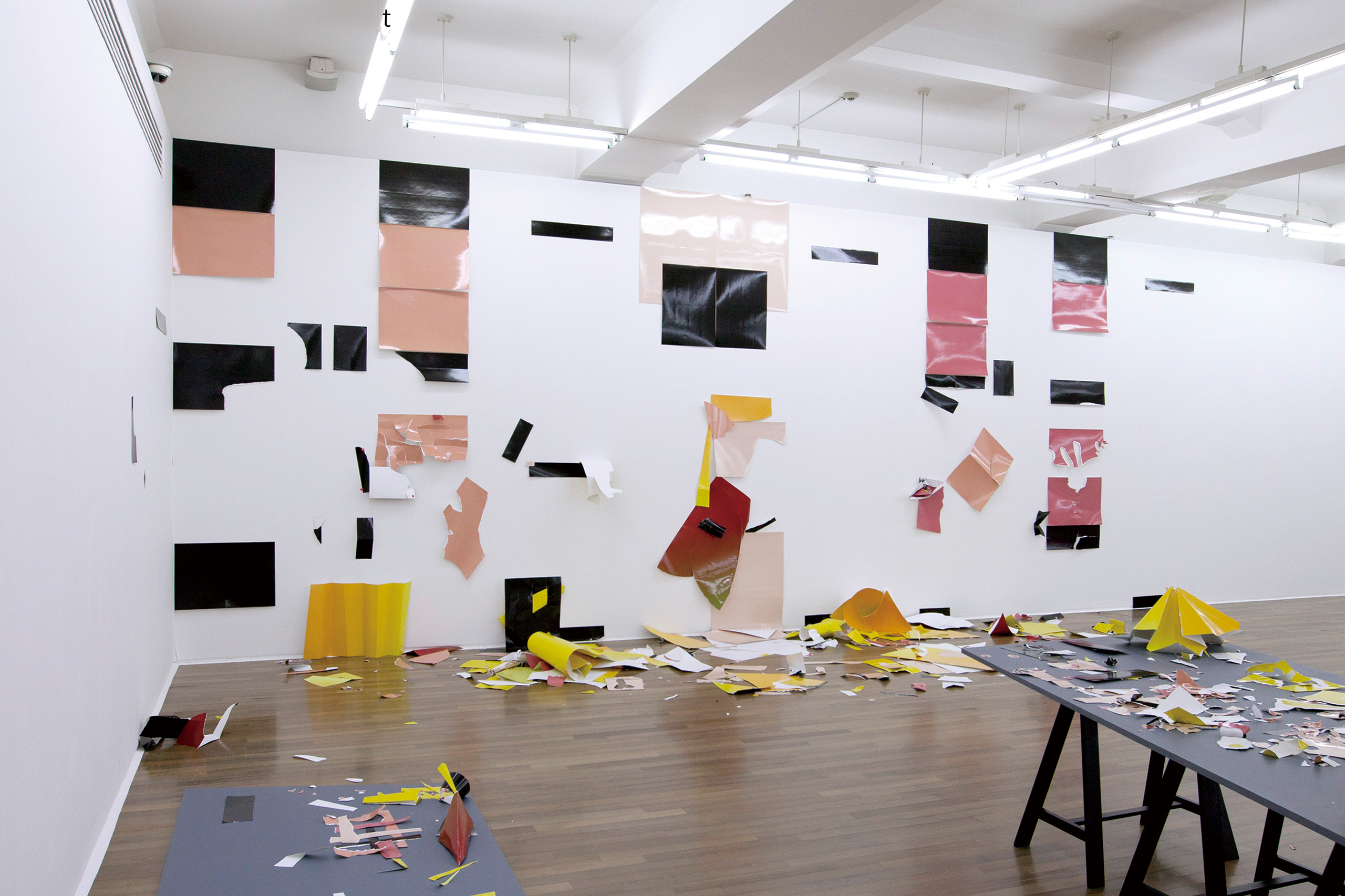 ‹면대면 Face to Face›(2015~) 시리즈는 대량 인쇄 주문을 통해 제작한 출력물을 건물의 유리창, 벽돌처럼 사용하며 전시장의 벽면에 도시의 건축 환경을 그리는 설치 작업이에요. 포토샵이나 일러스트레이터 프로그램으로 그린 각 장면의 부분들을 종이 위에 담아 물질화하는 것인데요. 하나의 그림 데이터가 몇백 장으로 복제되고, 그 무리가 모이면 현대 도시의 건축물이 생성되죠. 대상에 따라 인쇄 프로세스의 옵션을 다르게 선택하고 다양한 후가공법을 활용해서 재현의 디테일을 추가하거나 이미지를 입체화했고요. 전시 성격에 따라 전시장에서 장면을 구현하고 남은 인쇄물은 작업 주변에 두고 관객들이 가져가서 활용하거나 그 자리에서 직접 조형할 수 있도록 하기도 하는데, 그 과정에서 제가 그린 장면은 자연스럽게 다른 사람의 개입을 받으며 변화하게 되죠. 제가 관찰하고 그리고 싶은 건축이라는 구축적 행위와 사람의 문화가 그런 모습이었어요. 그래서 저는 작품에 여지를 만들고, 사람들은 제 작품에 반응하며 적극적인 행동 하나를 하게 되죠. 전시장에 자신의 흔적을 남기는 일을 꽤 즐거워하세요. 건물과 건축 같은 환경은 움직이지 않고 고정적이라고 인식하기 쉬운데요. 처음이 어떻게 그려지고 어떤 방식으로 만들어졌든 간에 접촉하며 사는 사람의 삶의 방식에 따라 단단한 모습도 변화하고 생애주기를 가지고 생존한다는 걸 알았어요. 건설적인 삶을 향한 사람들의 행동과 조형 행위는 공통점이 있어요.