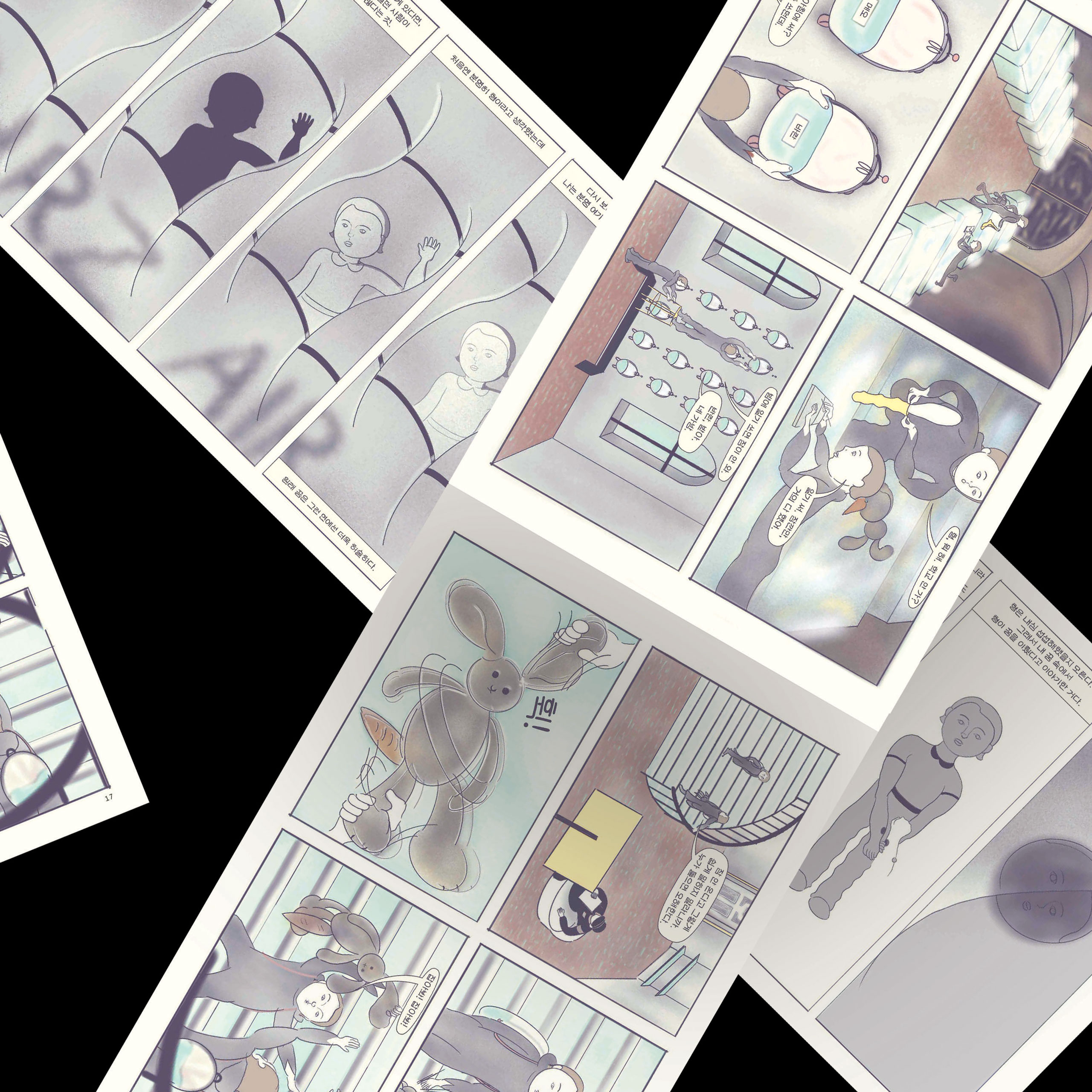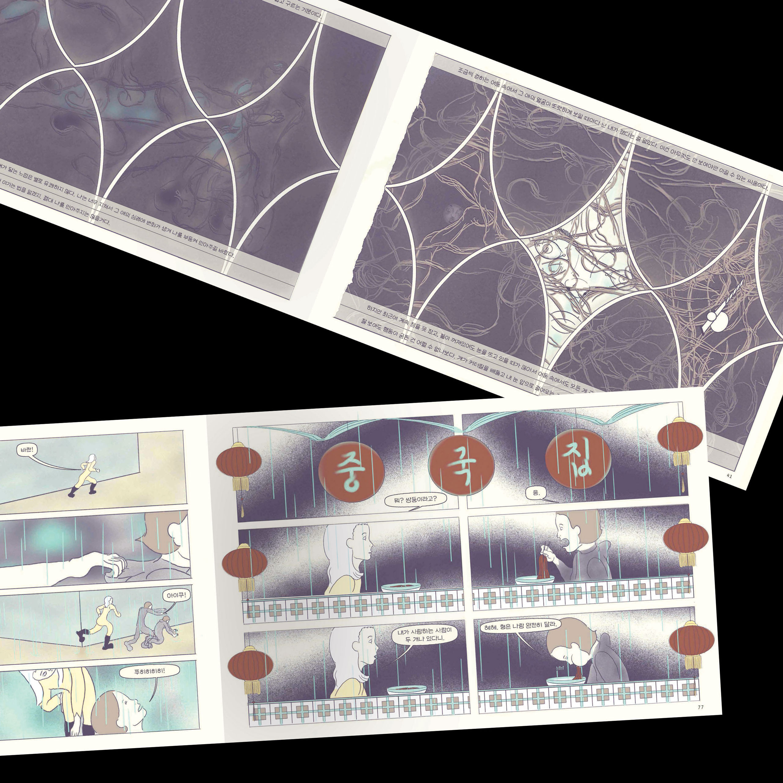 일러스트레이션을 의뢰받아 작업할 때는 그림을 통해 타인이 창작한 콘텐츠를 어떻게 해석하고 표현해서 소개할 것인지를 중심으로 작업 과정을 구성해요. 제 일은 대부분 출판과 관계가 있는데요. 작가, 편집자, 디자이너 등과 협업이 중요해요. 작가가 오랜 시간 책상 앞에 앉아 만들어낸 귀중한 텍스트 작업의 첫인상을 만드는 일이라서 대중성과 구매력도 고려해야 하죠. 만화나 전시를 위한 그림을 그릴 때는 제가 이 주제에 관해 어떻게 생각하는지 글로 먼저 정리하려고 노력하는 편이에요. 이 과정에서 떠다니는 생각을 제대로 갈무리하지 않으면 무엇을 그려야 할지 전혀 감이 잡히지 않을 때가 잦거든요. 그래서 그림 그리는 만큼의 시간을 여기에 할애해요.