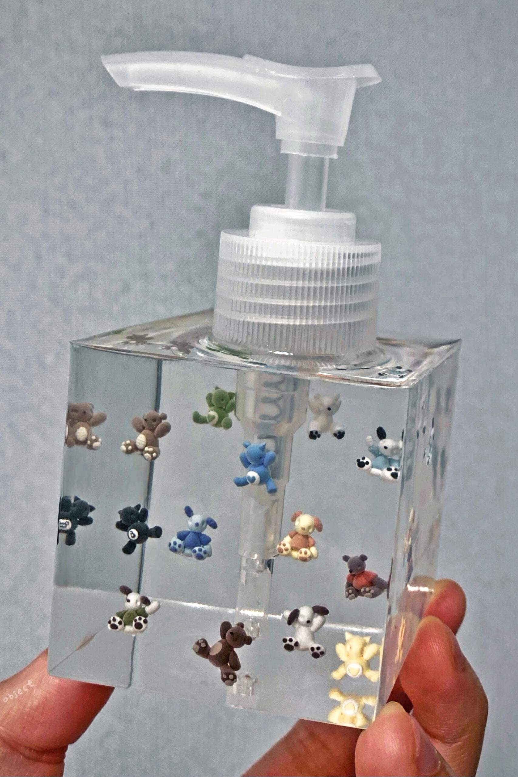 불투명한 펌프로 샴푸를 짜다가 ‘용기에 샴푸 말고 다른 게 들어있다면 어떨까?’ 생각이 들어서 만들게 된 작업이에요. 귀여운 친구들이 펌프 구멍으로 빨려 들어가지 않으려고 용쓰는 모습을 담았죠.