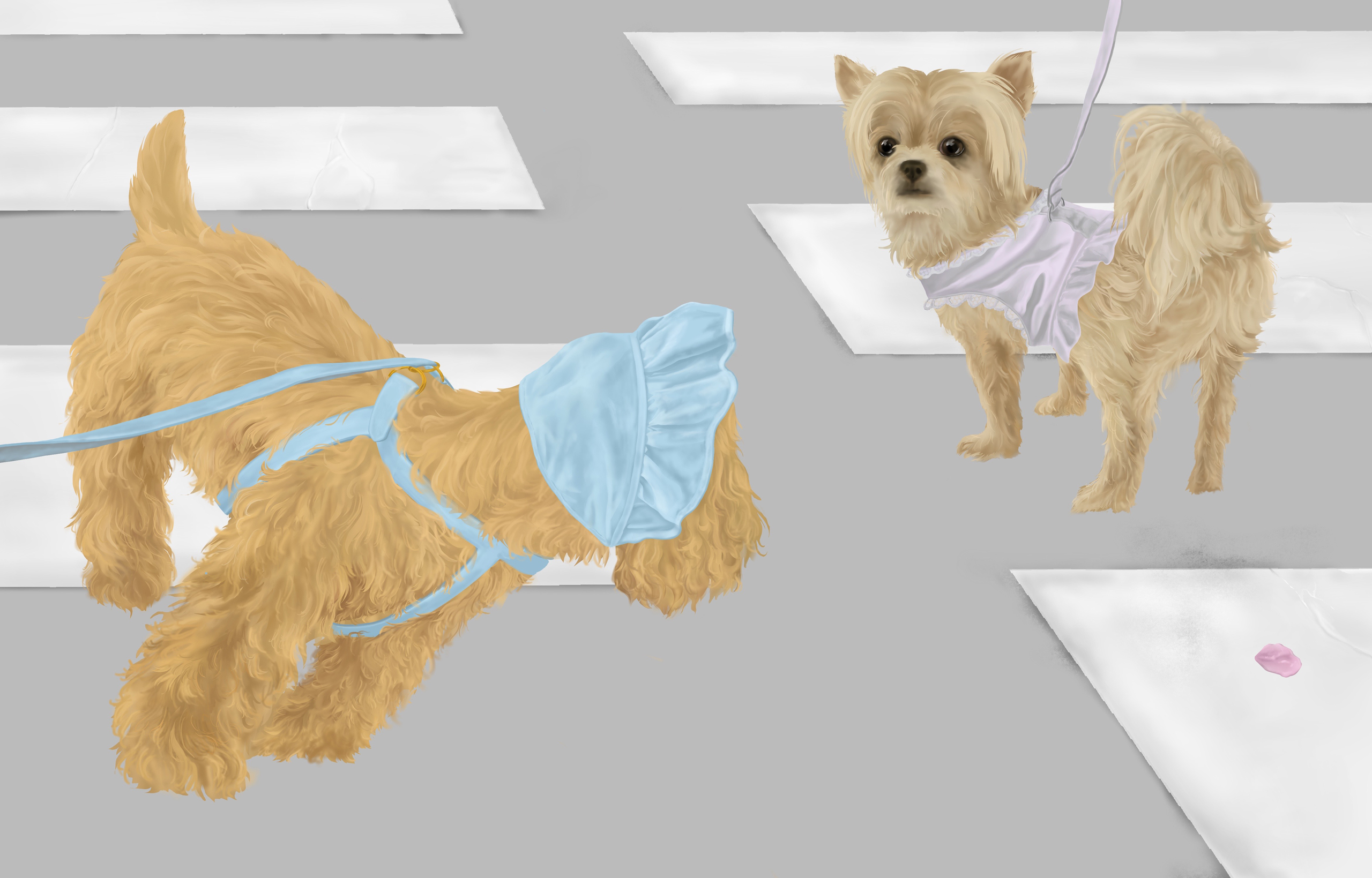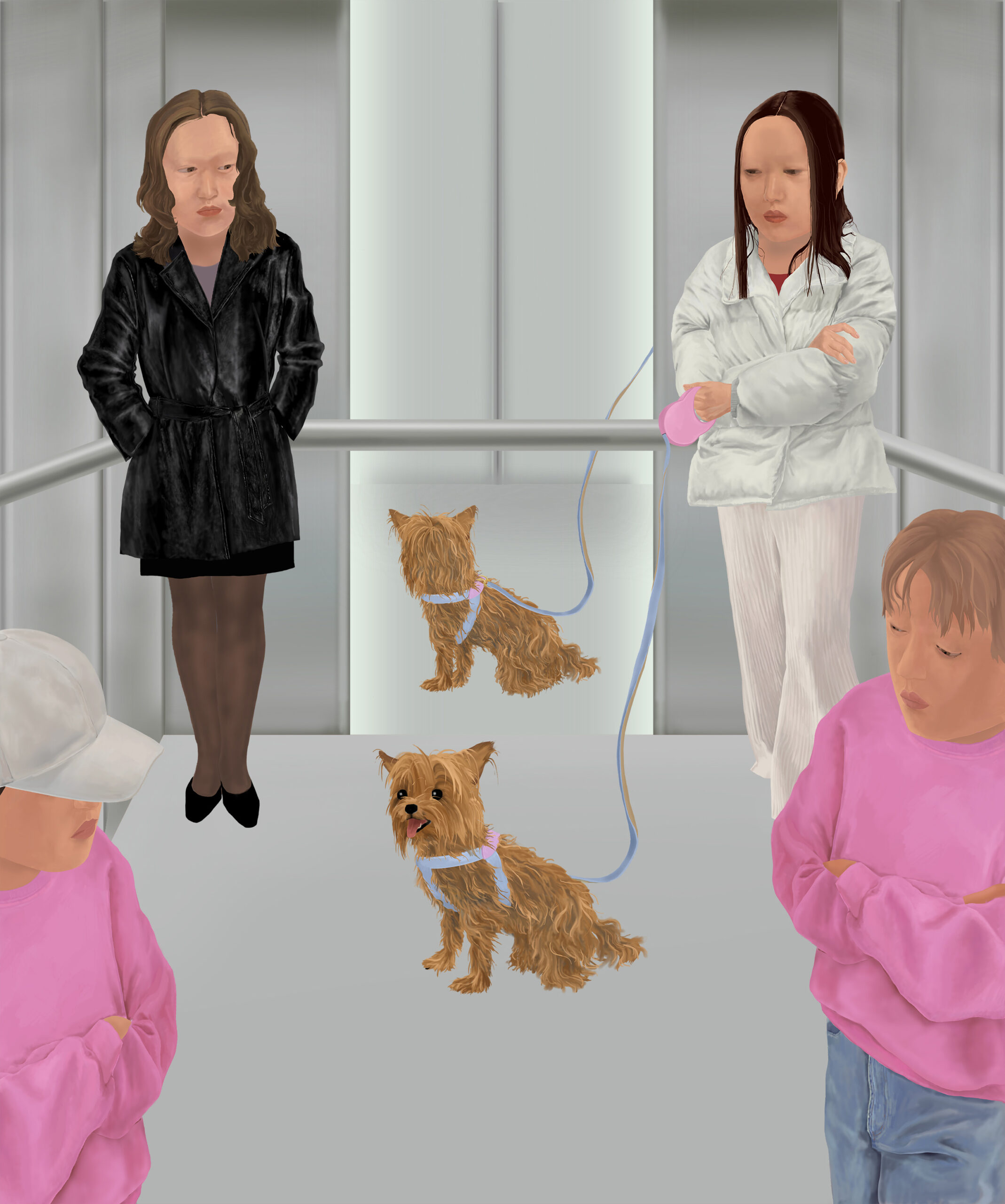 ‹엘리베이터 1, 2, 3›은 엘리베이터라는 좁은 공간과 그 안의 낯선 사람이 흥미로워서 그려본 작업이에요. 저는 엘리베이터를 탈 때 구석부터 찾아서 자리를 잡는 스타일이라서 더 그런지 모르겠는데, 보통 사람들도 다들 모서리부터 자리하는 것 같더라고요. 괜히 숫자 버튼을 바라본다든가, 층이 바뀌는 보거나, 각자 벽에 비치는 본인 얼굴만 바라보는데 유일하게 이 사람 저 사람에게 관심을 보이는 강아지와 그런 강아지에게만 유일하게 시선을 주는 사람들의 풍경이 재미있었어요. 그래서 ‘뭐가 어떻다’는 결론이 나진 않지만, 그냥 그런 사소한 우리들의 사는 모습이 제 그림에서 보였으면 좋겠어요.