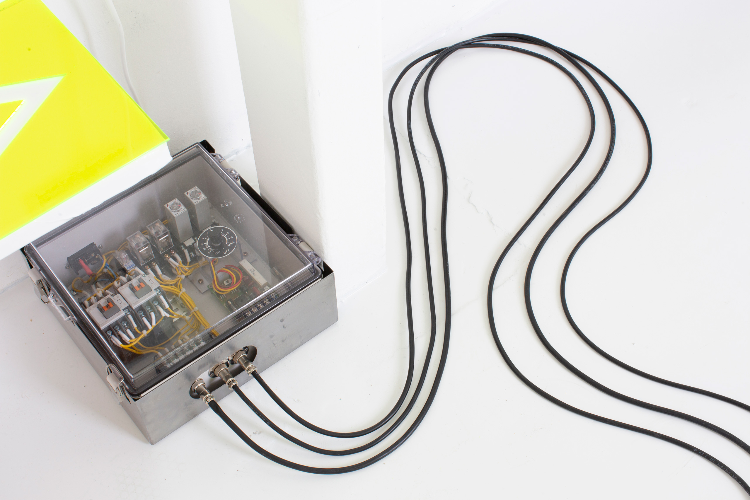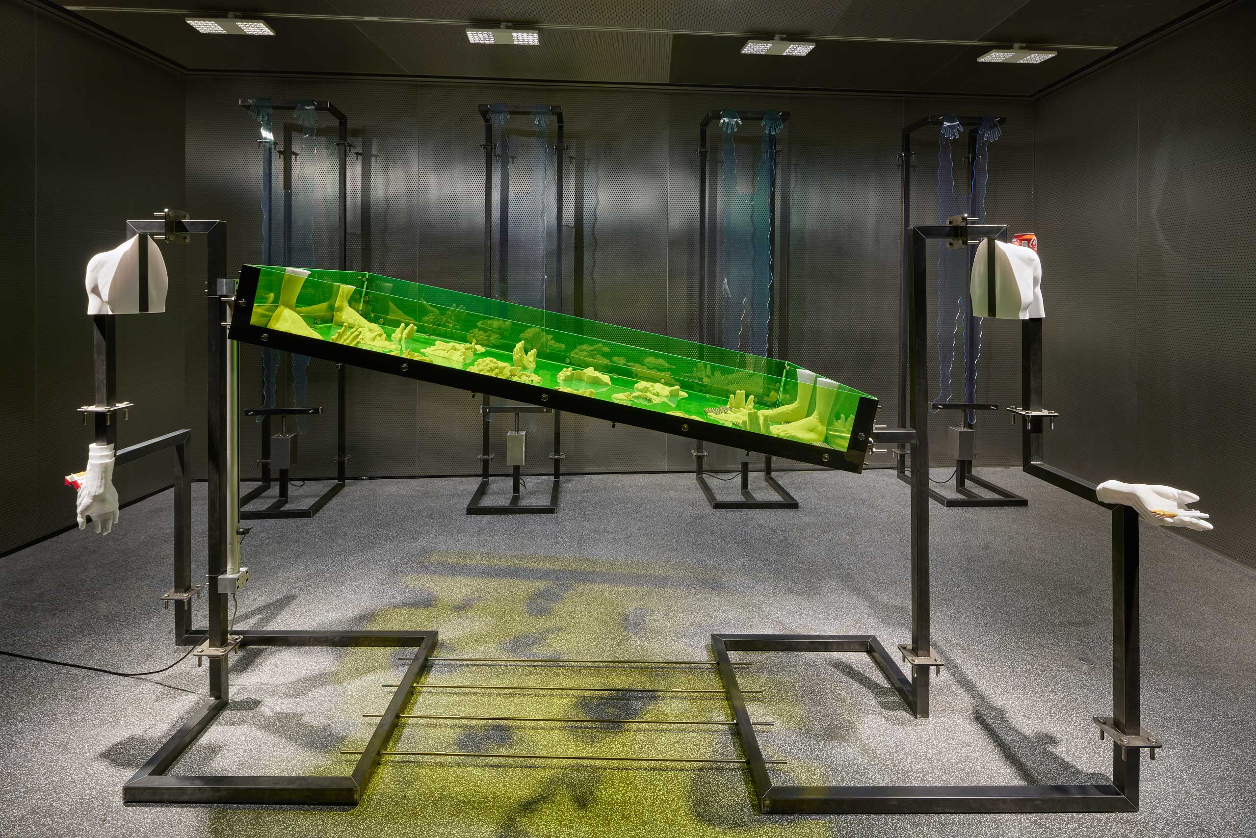 메인 작업이라고 할 수 있는 ‹The Fabulous Life #2›는 실제 공장에서 쓰이는 리니어 모터가 아래위로 움직이며 거대한 아크릴판을 계속 기울입니다. 아크릴판에는 쇠구슬 형태의 볼 베어링 여러 개가 기울기를 만들어내는 단차에 따라, 파편화된 신체 조각 고정물 사이를 한 방향으로 전진하며 수많은 상호작용을 부르죠. 부딪치고 튕기어 방향이 틀어지고 때로는 전진하지 못한 채, 신체 조각의 일부처럼 편입되어 특정 형상을 이루기도 합니다. 모터가 야기하는 단순하고 강력한 제스처를 통해 민감하고 무기력하게 반응하는 볼 베어링의 모습을 중점적으로 묘사한 것인데요, 이를 통해 저 자신이 경험하고 탐구한 현대 사회의 억압적인 구조와 이데올로기의 작동 방식을 거시적으로 시각화하고자 했습니다. 그리고 공장 혹은 실험실에서 사용하는 상분리기를 상상하며 작품을 구현했습니다.