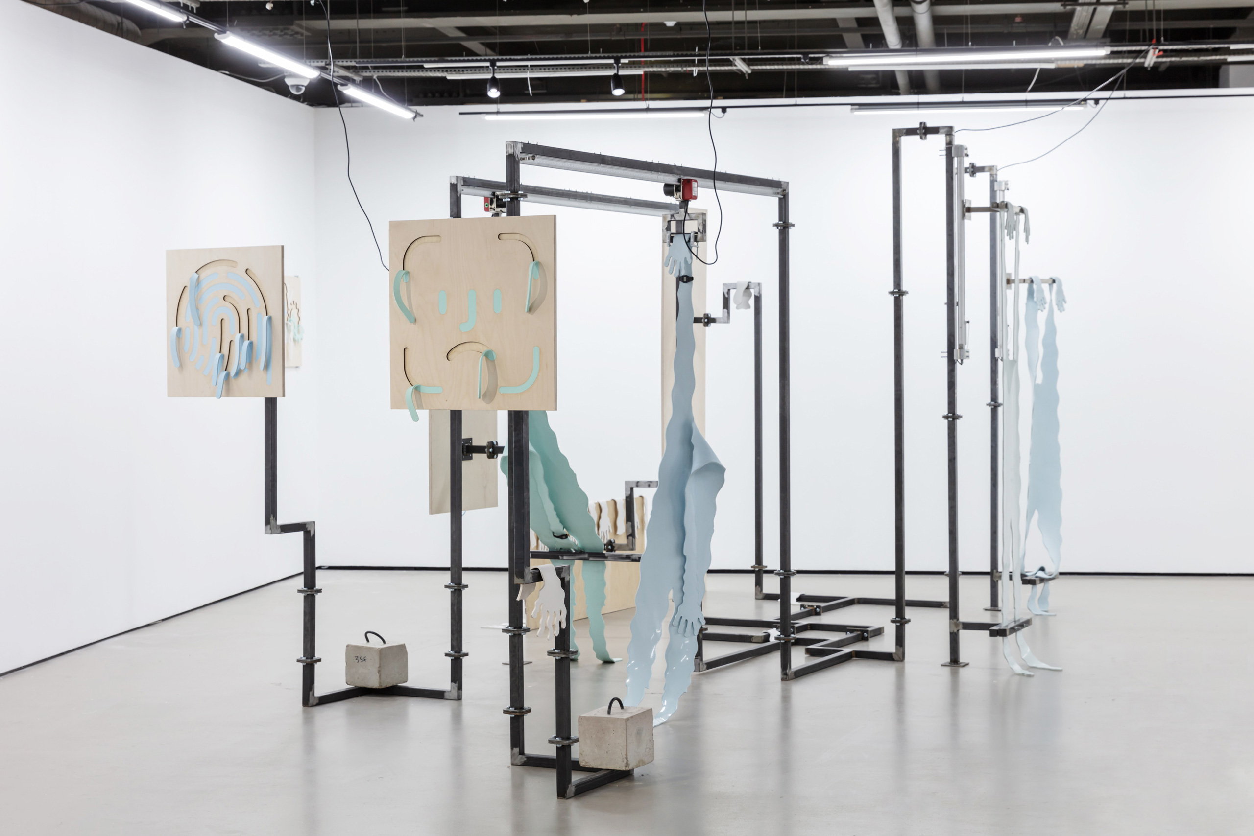 파운드리 서울 전시에서 등장했던 실리콘은 제 작품 속에서 형상화된 인간의 제조 공정 중 첫 번째 단계를 상징합니다. 저는 런던의 ‘자블루도비치 컬렉션Zabludowicz Collection’에서 선보였던 세 가지 작업인 ‹So Glad to Be Back›, ‹Hold me Tight›, ‹Better Luck Next Time #2›를 통해 다음 공정을 시각화하길 원했고 제2의 피부라 불리는 의복을 떠올리게 되었습니다. 의복은 인간의 형상을 구조적으로 가장 잘 표현하면서 동시에 다양한 정보를 지니고 있습니다. 저는 현대 사회에서 인간이 의복을 입으며 사회화가 시작된다고 생각합니다. 인구 증가와 산업화로 인해 대량으로 생산한 의복은 현대 사회를 함축적으로 가장 잘 반영하는 물건 중 하나이기도 하죠. 의복은 인간의 신체를 보호하기 위해 신체와 유사한 모양으로 디자인되었습니다. 저는 직물이 가지는 물질성보다는 그것이 옷의 재료가 된다는 목적성에 더욱 초점을 두고 이번 전시를 구상했습니다. 그리고 두 가지 서로 다른 부류의 물질인 직물과 철을 사용해 사회에 종속된 인간의 모습, 지배와 피지배의 관계, 권력의 움직임에 대해 고찰합니다.