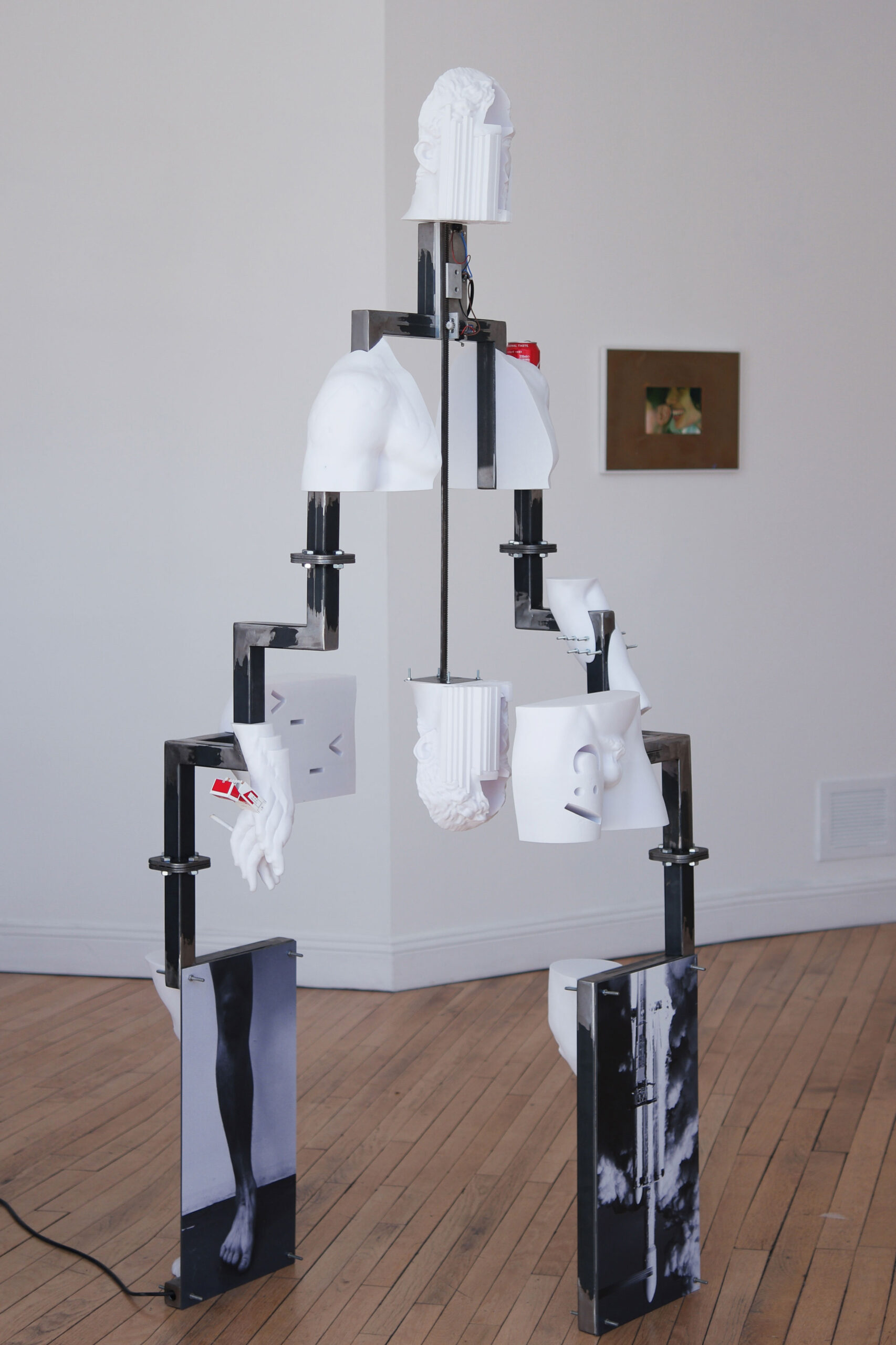 ‹Hey, It is me!›, 2021, Steel, motor, controller box, petg, cigarette package, aluminium can, socks, digital print on aluminium, 62×215×73cm, 27초