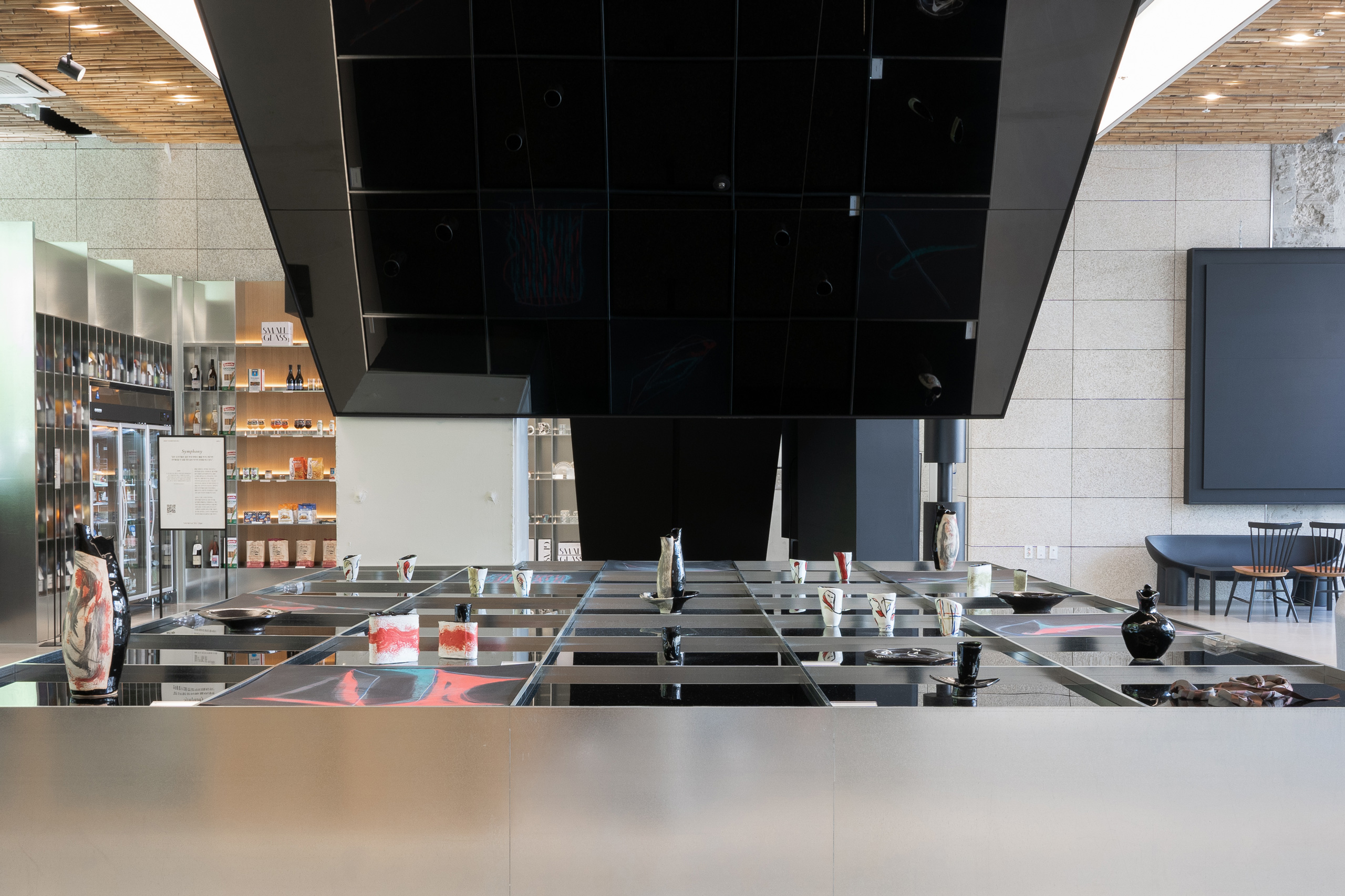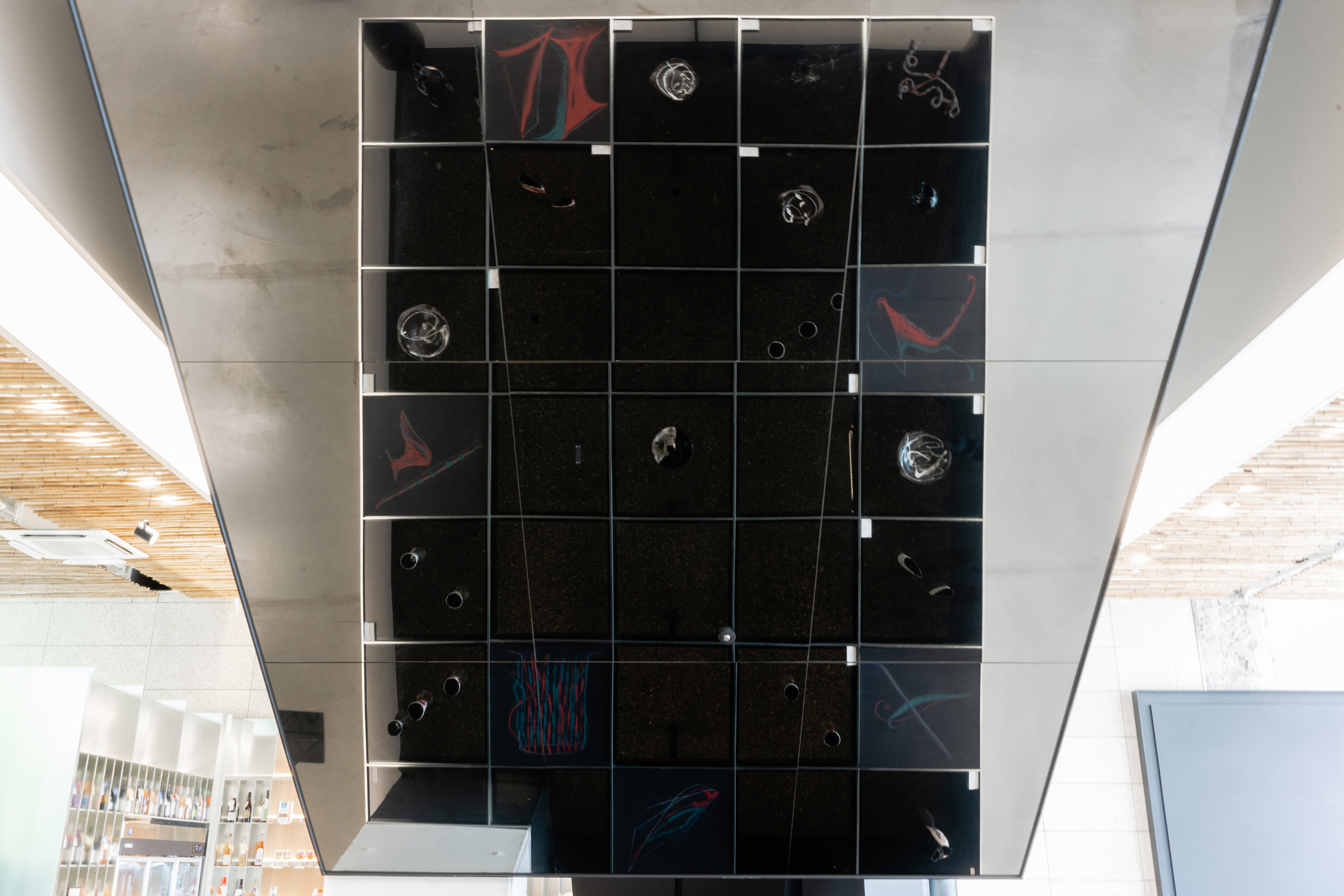 흑경 전시대 위 천장에 설치한 유리에 비친 모습