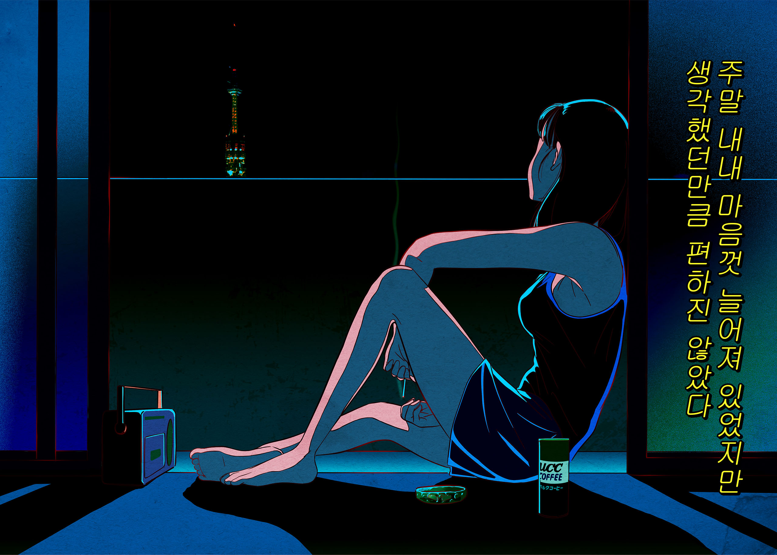 초기에는 일본의 쇼와(昭和) 시대―1926년 12월 25일~1989년 1월 7일―후기에 나온 음악, 식품, 문화에 영향을 많이 받았습니다. 애니메이션은 물론이고, 당시 활동하던 작가의 아트워크도 자극을 줬죠. 그래서 초창기 작업에서는 쇼와 느낌이 지금보다 더 짙어요. 지금은 그 스펙트럼을 넘어 오디오 기기와 가구까지 제 작품관에 영향을 끼치고 있습니다. 음악만 하더라도 예전엔 시티팝만 애청했는데, 이제는 재즈나 한국 인디 음악까지 두루 듣고 있죠. 이제는 무엇이라고 지목하기 어려운 상황입니다. 제가 좋아하는 것이 시간의 흐름에 따라 바뀌는 것처럼, 그림 역시 바뀌니까요.