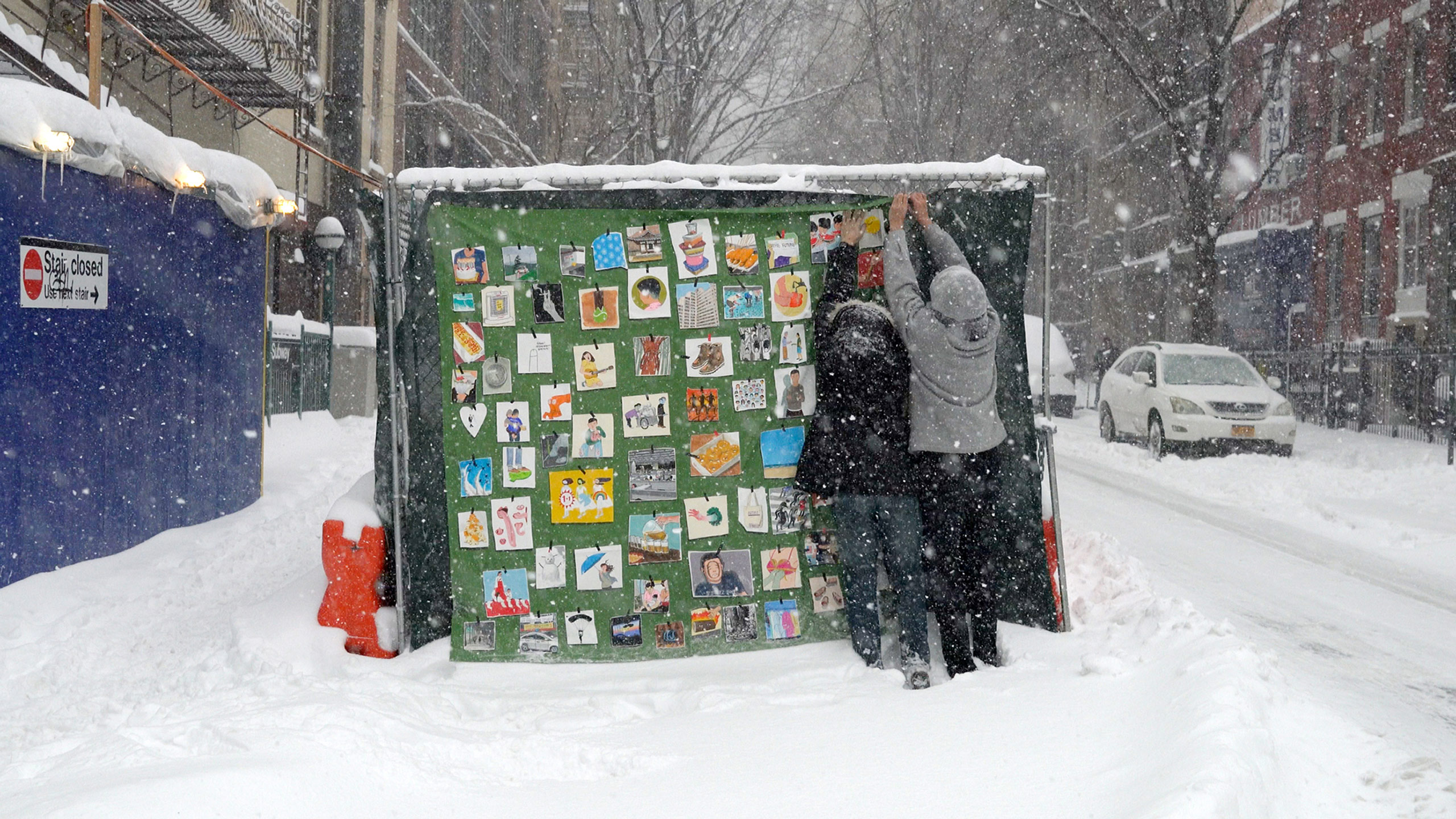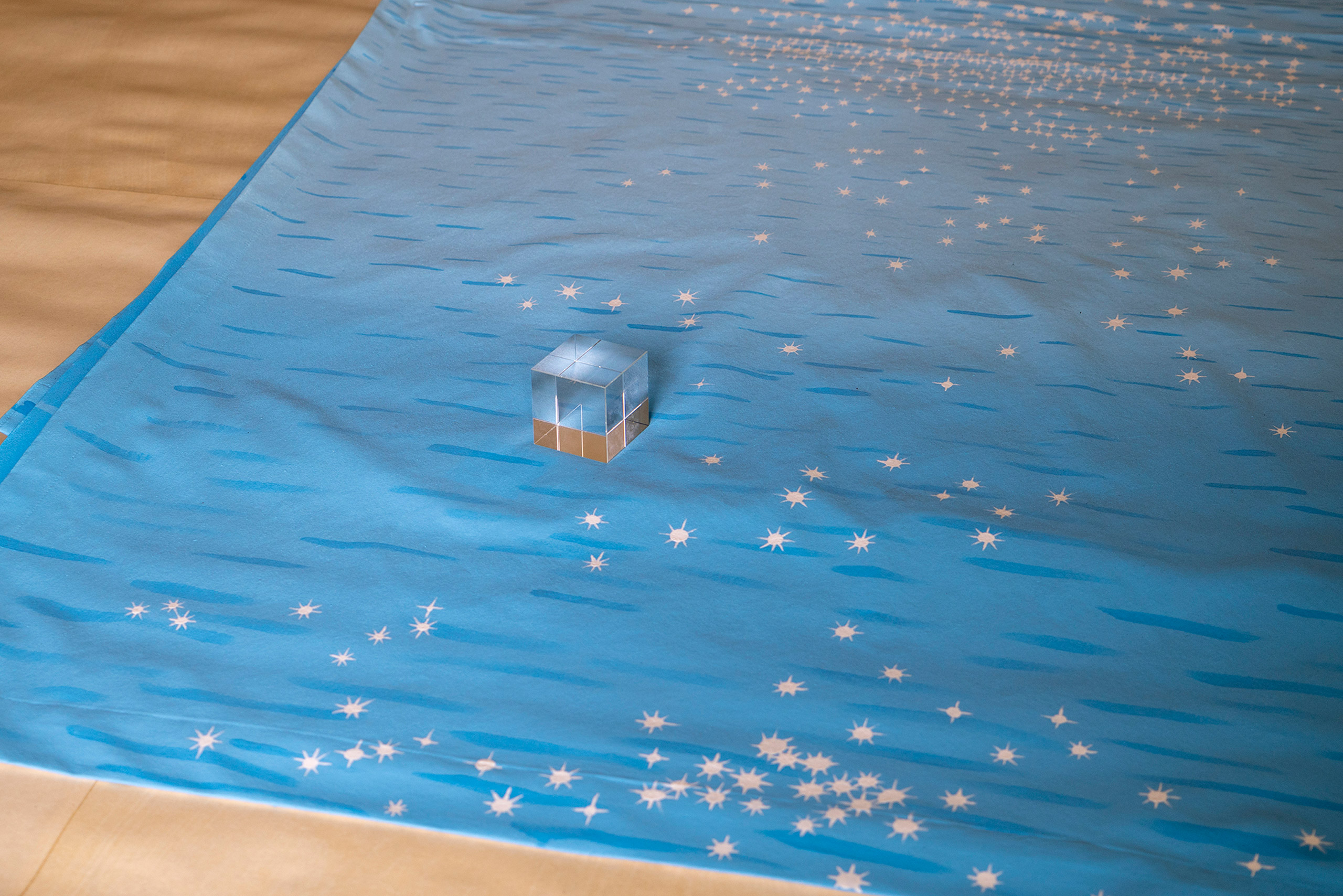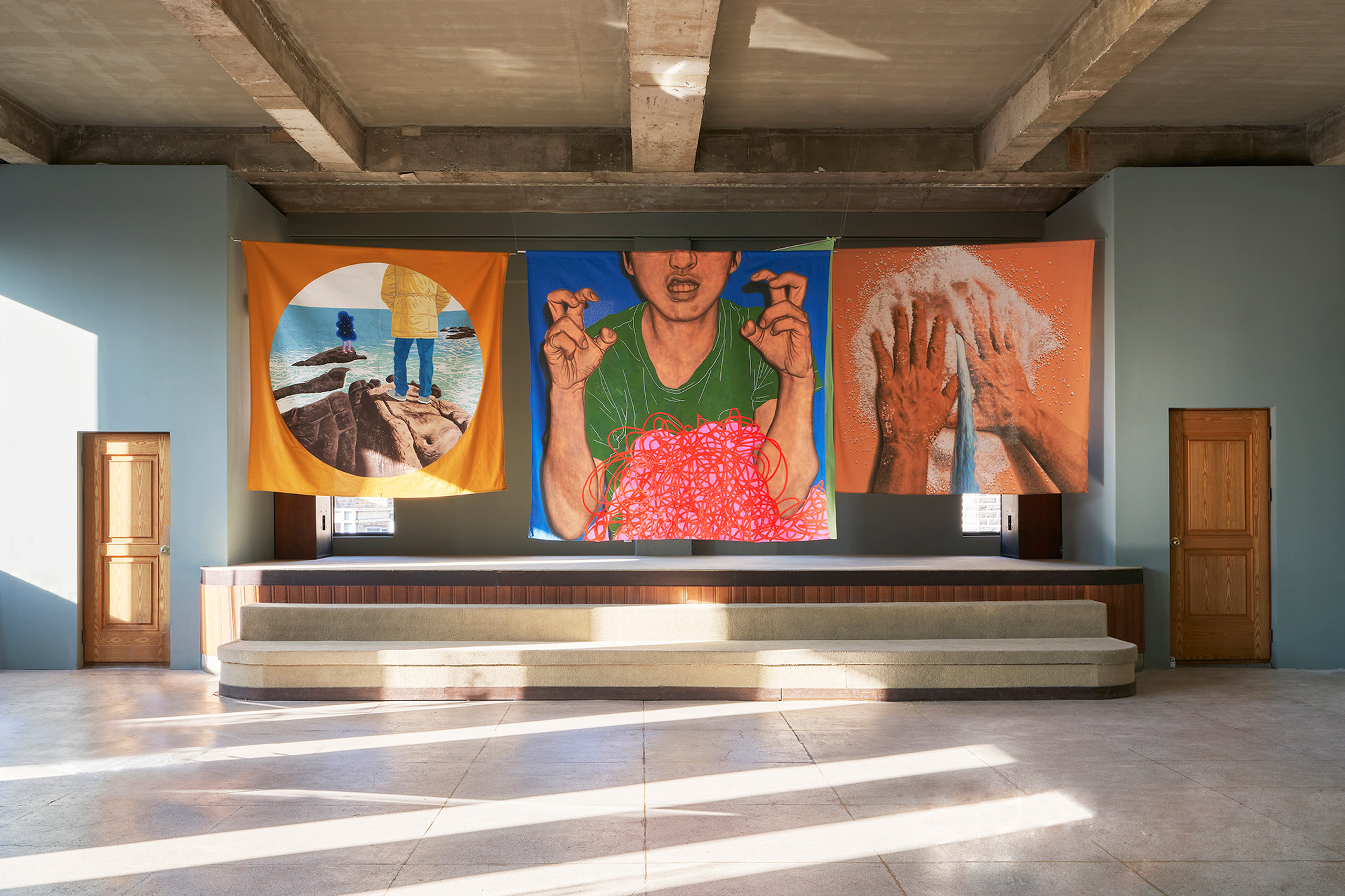 ‹접혔다 펼쳐지는 그림 뉴욕 (2016) 앞에서 끌고 뒤에서 밀며 Relay to Continue›, 2015, 천 위에 수성 페인트, 아크릴릭 과슈, 210×210cm © Photo by 권용주