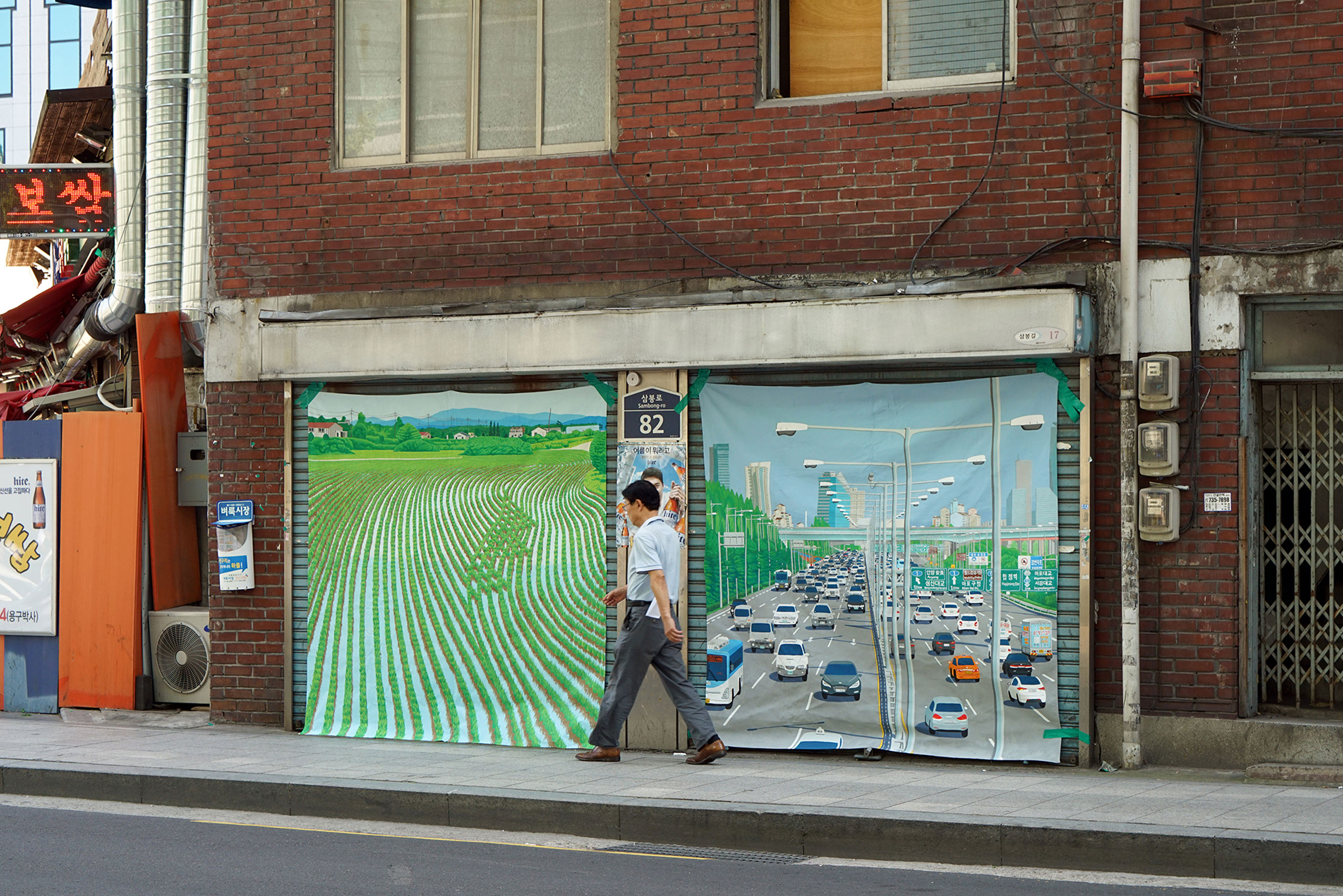 ‹접혔다 펼쳐지는 그림 서울 (2015) 쌀농사 Landscpae of Farming Village›, 2015, 천 위에 수성 페인트 , 아크릴릭 과슈, 210×210cm