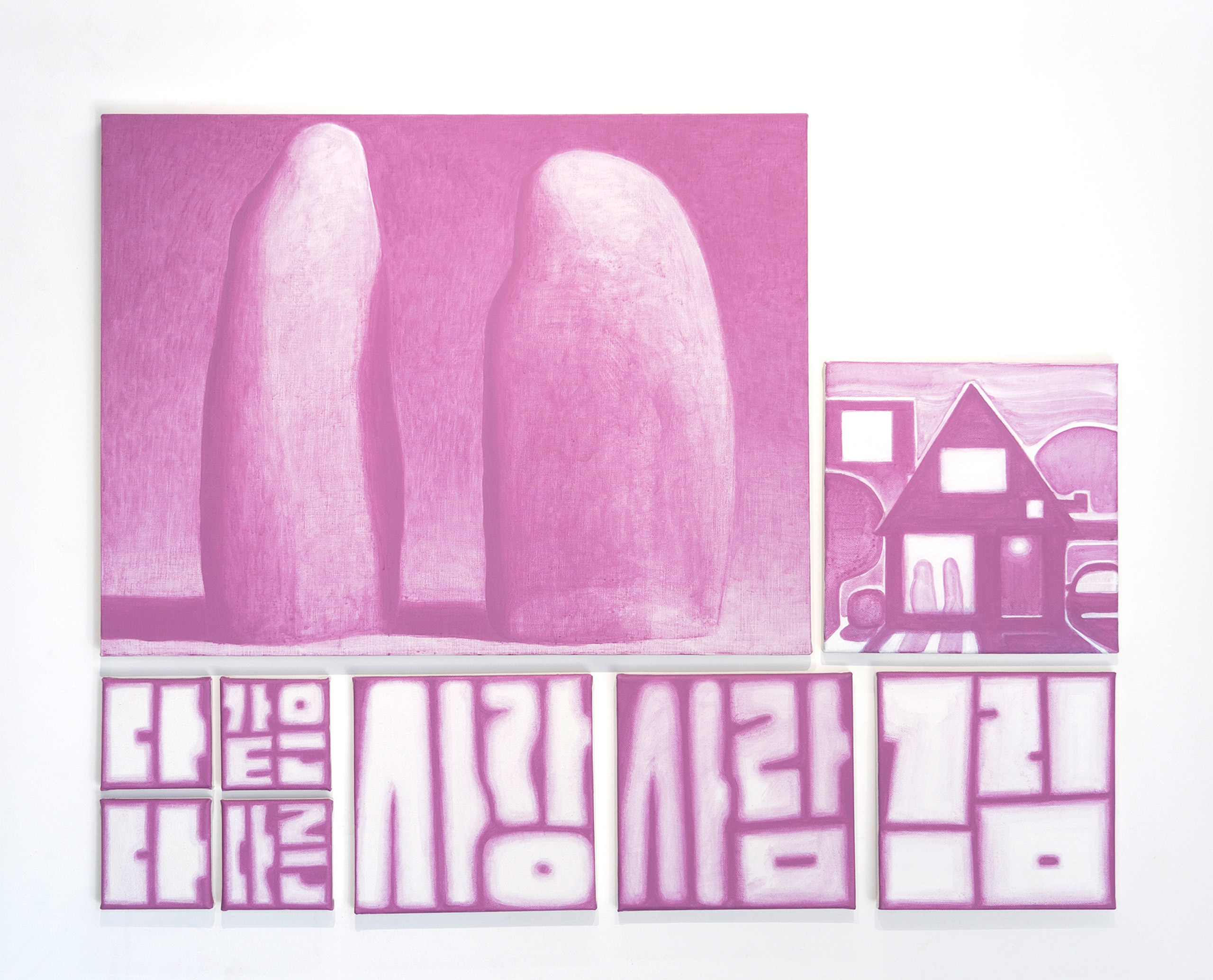 ‘자수정 회화’라는 이름의 연작을 그리기도 했어요. 색이름이 자수정색이라서 연작의 이름으로 삼았죠. 자수정색은 분홍 같기도 하고, 연보라색 같기도 한 오묘한 색채를 띠어요. 어떤 경계에 있는 색처럼 다가오기도 하고요. 정확히 명명하기 어려운 색이죠. 그런 색 하나만 이용해서 작업했어요. 제가 단색으로 그림을 그리는 경우는 노래로 치면 발라드 장르와 비슷해요. 사랑이라는 테마로 작업을 하려다 보니 자연스레 소묘하듯 그림을 그리게 되더군요. 제 그림이지만, 좋아요. 좀 더 발전시키고 싶습니다.