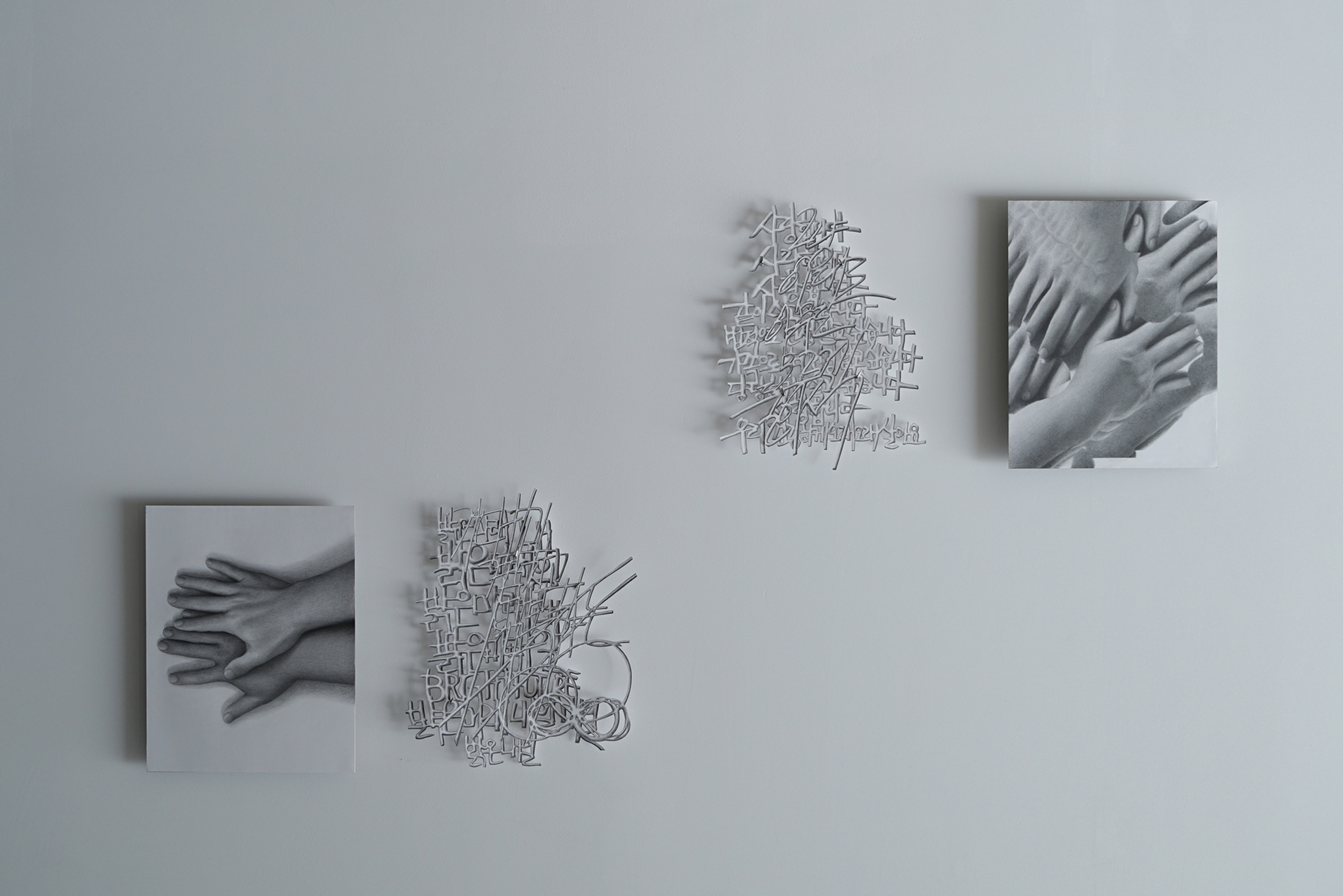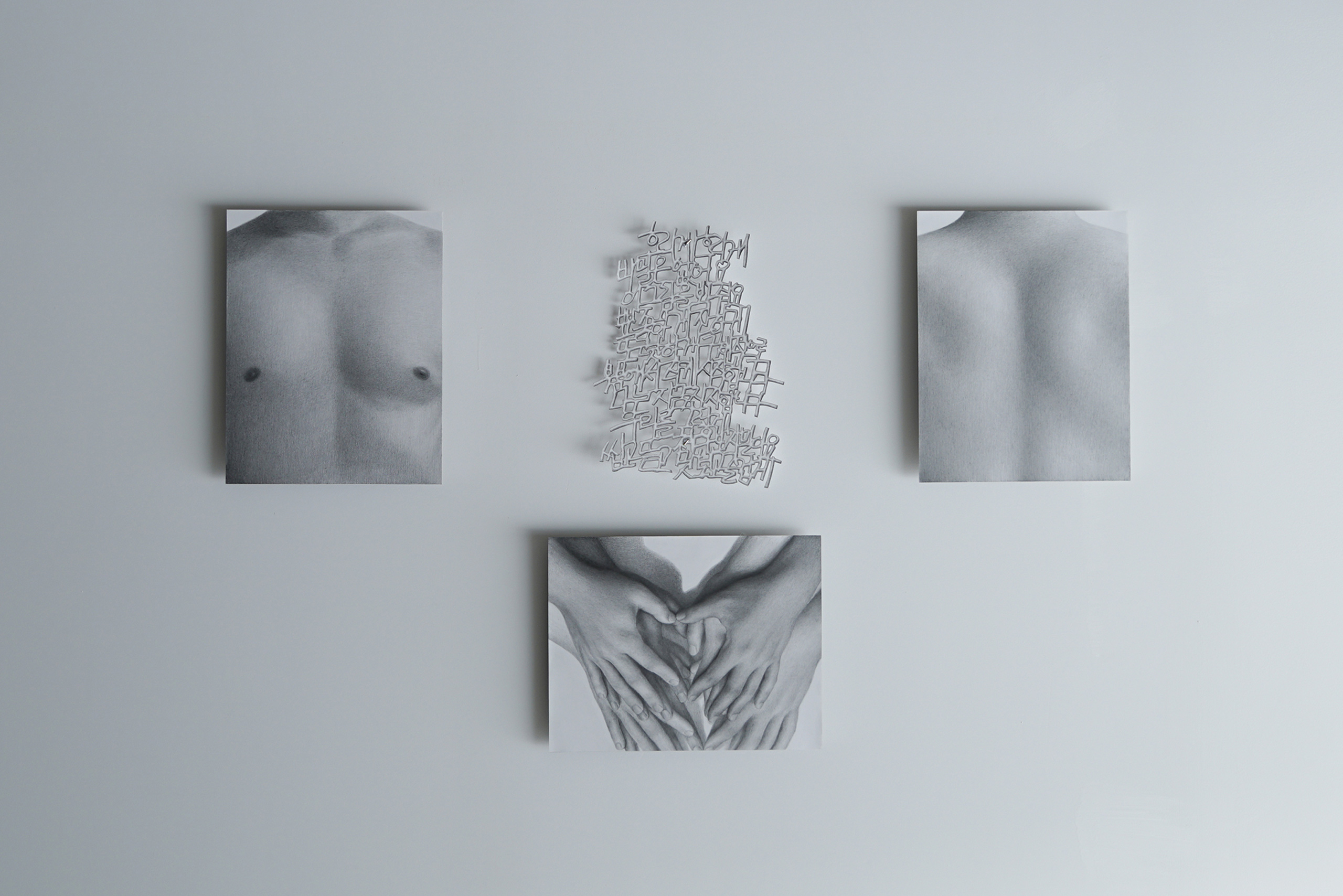 또 다른 소묘 작업으로 ‹기대고 포개고 반복하는›이 있어요. 사랑과 정체성을 주제 삼아 그린 작업입니다. 부모님의 손과 제 손 그리고 제 애인의 손을 모델로 사람 손을 그렸어요. 거기다 글씨도 쓰는 등 종이와 연필이라는 단순한 재료로 재미난 시도를 했죠. 그동안 갈 길을 잃었던 연필 소묘 작업을 이어서 그리는 연작이라서 제게는 더욱더 의미 있는 작업이었습니다. 저는 연필의 짙음과 아주 연약하고 여리게 쌓아 단단하게 만드는 과정을 좋아해요. 이 작업 역시 제가 아낀답니다.