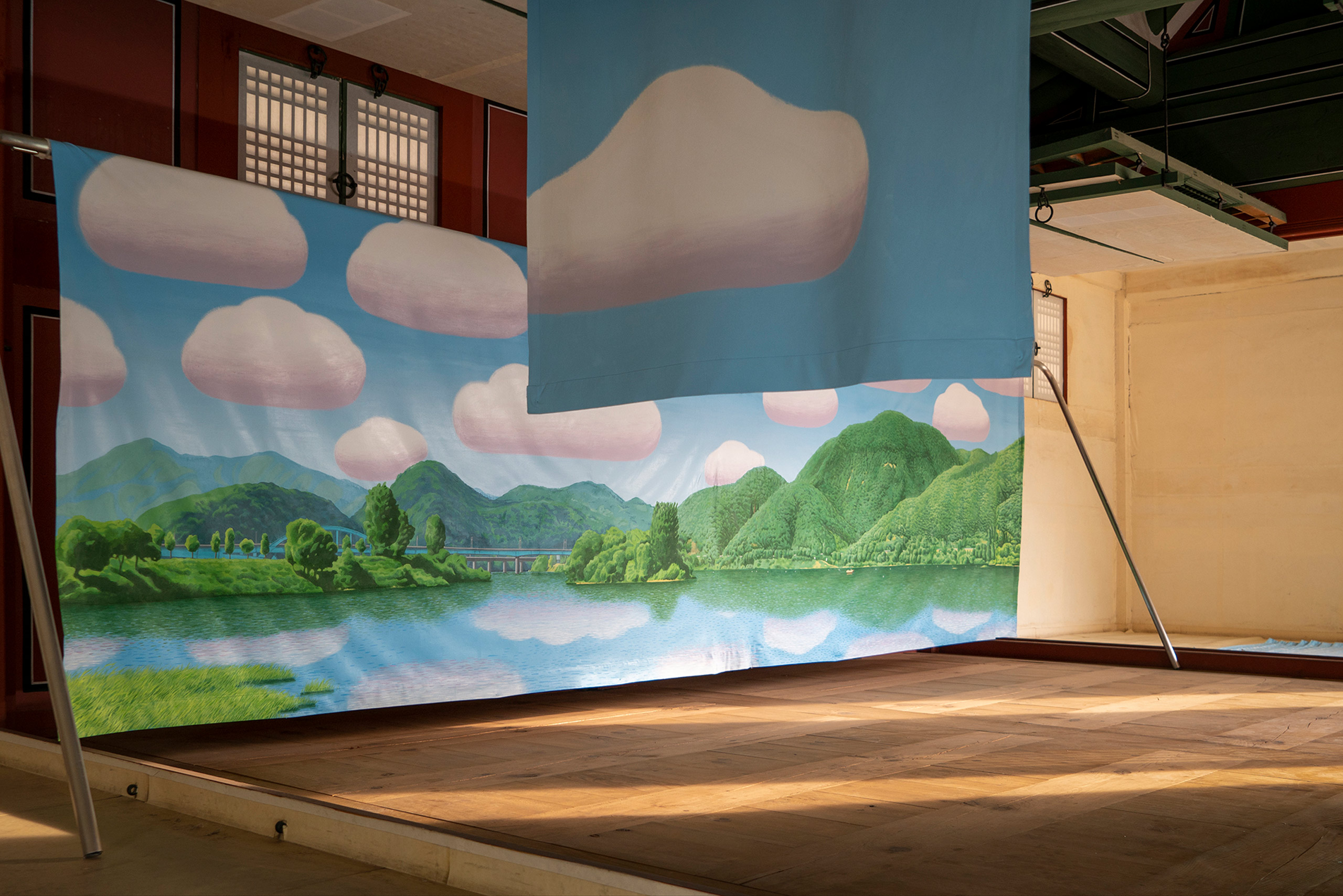 ‹무엇을 그려야 할지 몰라 한강에 갔다 I went to Han River because I didn t know what to draw›, 2022, 천 위에 아크릴릭 과슈, 수성 페인트, 246×413cm