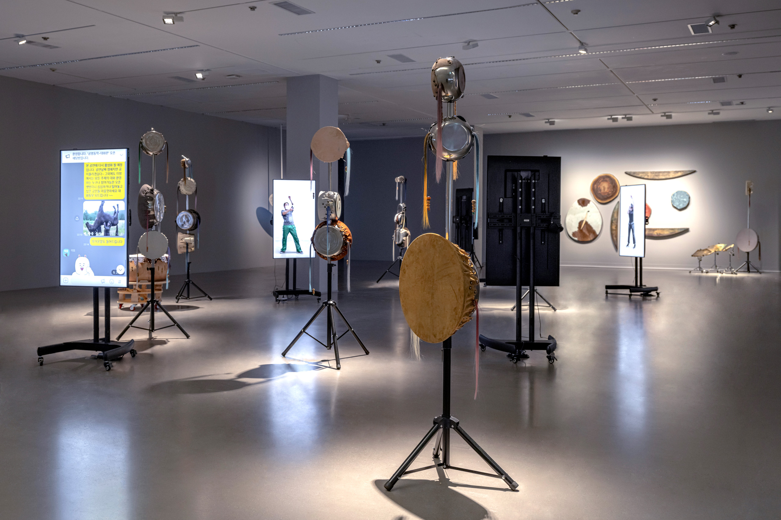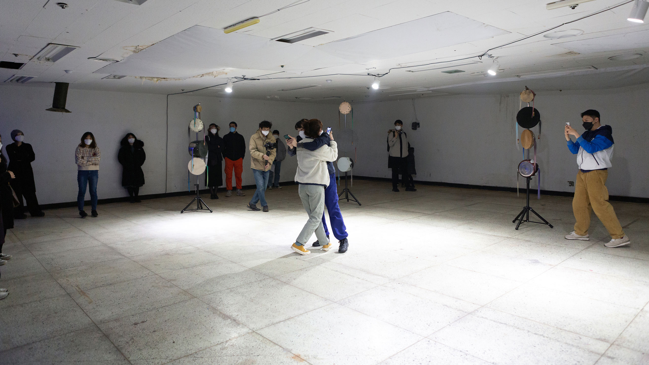 영감이라는 것이 어떨 때는 그냥 나타나기도 하고, 반대로 아무리 쥐어짜도 안 나타날 때가 있는 것처럼 창작 과정 또한 어떠한 결과물을 얻기 위해서 많은 노력을 들이지만 잡힐 듯 안 잡히는, 보일 듯 안 보이는 것의 연속인 것 같습니다. ‹공명동작›이라는 작품도 이전부터 해오던 작업 방식과 개인적인 관심 분야 그리고 결정적으로 ‘북메우기’라는 전통 타악기 소재를 접하면서 시작되었는데요. 이런 게 처음부터 어떤 확실한 콘셉트를 정하고 이루어지기보다는 그동안 축적된 요소와 경험을 통해 현재의 작품으로까지 전개가 되는 것 같아요. 대부분의 영감이나 예술적 소스가 처음에는 굉장히 강렬하게 다가와서 얼마 동안은 그것에만 계속 몰두하는 경우가 많은데, 그렇다고 바로 작업으로 옮기거나 하지는 않습니다. 오히려 생각을 날려 보내는 습관이 있어서, 강렬하게 다가왔던 영감인 만큼 시간을 두고 묵히는 과정에서 휘발되면 딱 거기까지라고 생각하고 지워버려요. 하지만 오랜 시간이 지나도 같은 아이디어가 다시 떠오르면 작품으로 옮기려고 노력하는 편입니다. 더불어 퍼포머와의 협업적 관계라는 부분 또한 중요한 지점인데요. 작품에 관한 이야기와 더불어 개개인의 특징과 성향을 알아가는 과정이 흥미롭습니다. 언제, 어디서, 누굴 만날지 알 수 없으니까요. ‹공명동작› 퍼포먼스는 (불)소통의 조건 속에서 열린 몸과 매개적 역할을 통해 개인과 개인, 서로가 서로를 감각하는 소통의 가능성을 실험하는 다원적 형태의 프로젝트에요. 그래서 작품을 바라보는 이의 선택적 역할에 따라 위와 같은 실험의 완성도가 매번 조금씩 달라지는 것 같습니다.