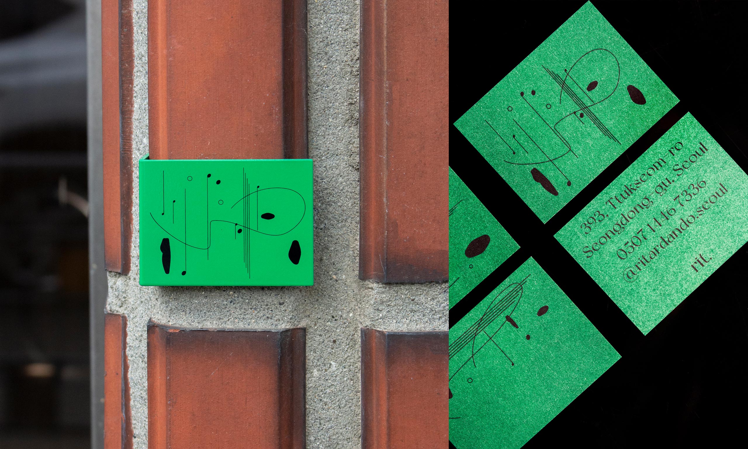 성수에 위치한 칵테일바 ‘리타르단도(rit)’의 브랜딩 작업도 있습니다. 리타르단도Ritardando는 ‘점점 느리게’라는 음악 용어인데요. 저는 사람들이 먹고 마시는 동작이 마치 음악을 연주하는 모습 같다고 생각했어요. 그래서 사람들의 동작을 선에 대응시켜 선율이 보이는 것처럼 아이덴티티 그래픽을 만들었습니다. 그리고 메뉴판과 명함에 업장의 메인 컬러인 그린을 사용해 공간과 통일감을 주었어요. 가벼운 그린보다는 농도가 짙은 그린 컬러를 리소그래프로 표현했죠. 칵테일을 마실 때 느낄 수 있는 묵직하면서도 발랄한 목 넘김을 알맞은 컬러로 표현한 것 같아서 만족해요.