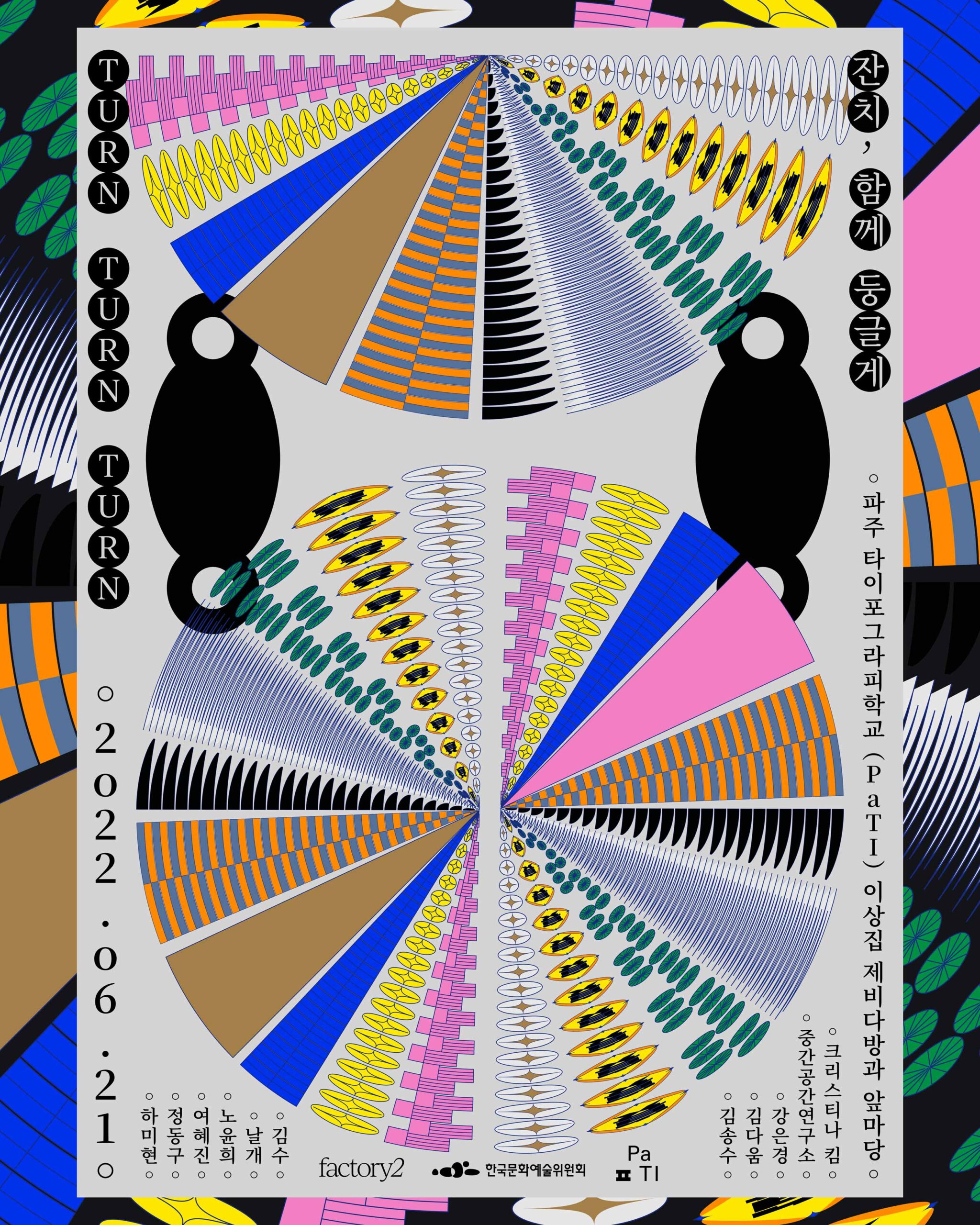 퍼블릭아트 프로젝트 ‘돌고, 돌고, 돌고’의 한 단락을 갈무리하는 프로그램 ‘잔치, 함께 둥글게’의 포스터도 소개하고 싶어요. 다양한 형태의 프로젝트와 사람들이 둥글게 둘러앉아 있는 모습을 시각화했습니다.