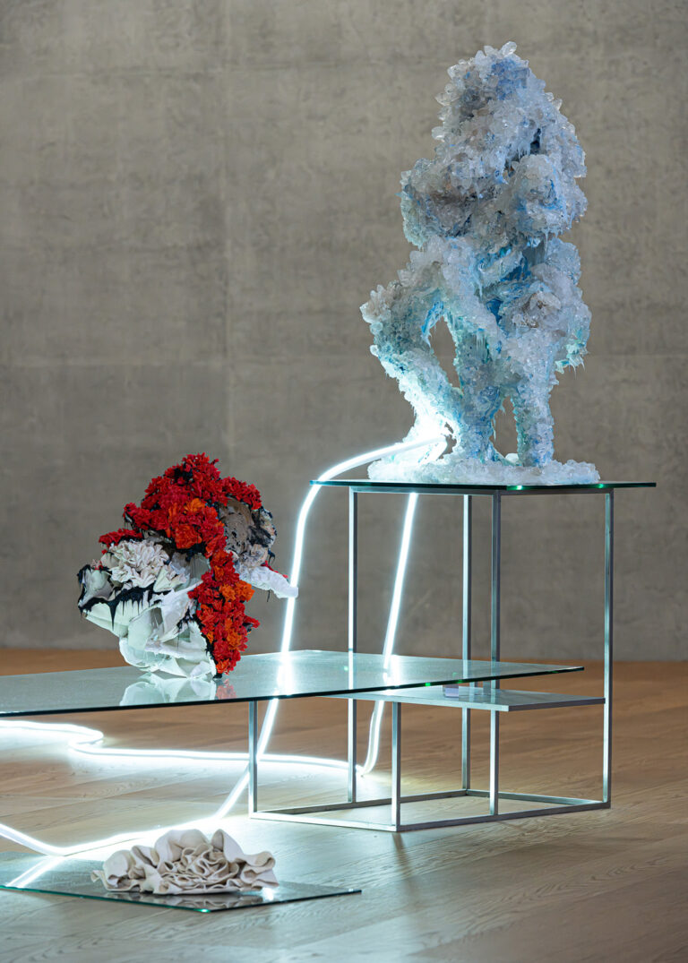 ‹Cycle›(2023)이 흥미로운 예인 것 같아요. 산호가 구축되는 방식을 생각하며 만든 작업인데요. 2021년 열었던 개인전 «Floating people»에 선보였던 신체 형태의 조각 작업을 새로운 조각의 뼈대로 재활용하고, 여기다가 수정, 광물, 산호 등의 자연물과 산업 재료가 붙으며 재구축되는 광경을 생각하며 계속 변주되고 순환 속에 놓이는 상황을 생각하며 작업했어요. 산호초가 해양 생태계에서 뼈대 혹은 폐 역할을 맡으며 외부로 구축되고 확장되는 모습, 또 환경 보호를 위해 투입한 인공 구조물에 산호가 이식되어 성장하는 모습을 상상했습니다.