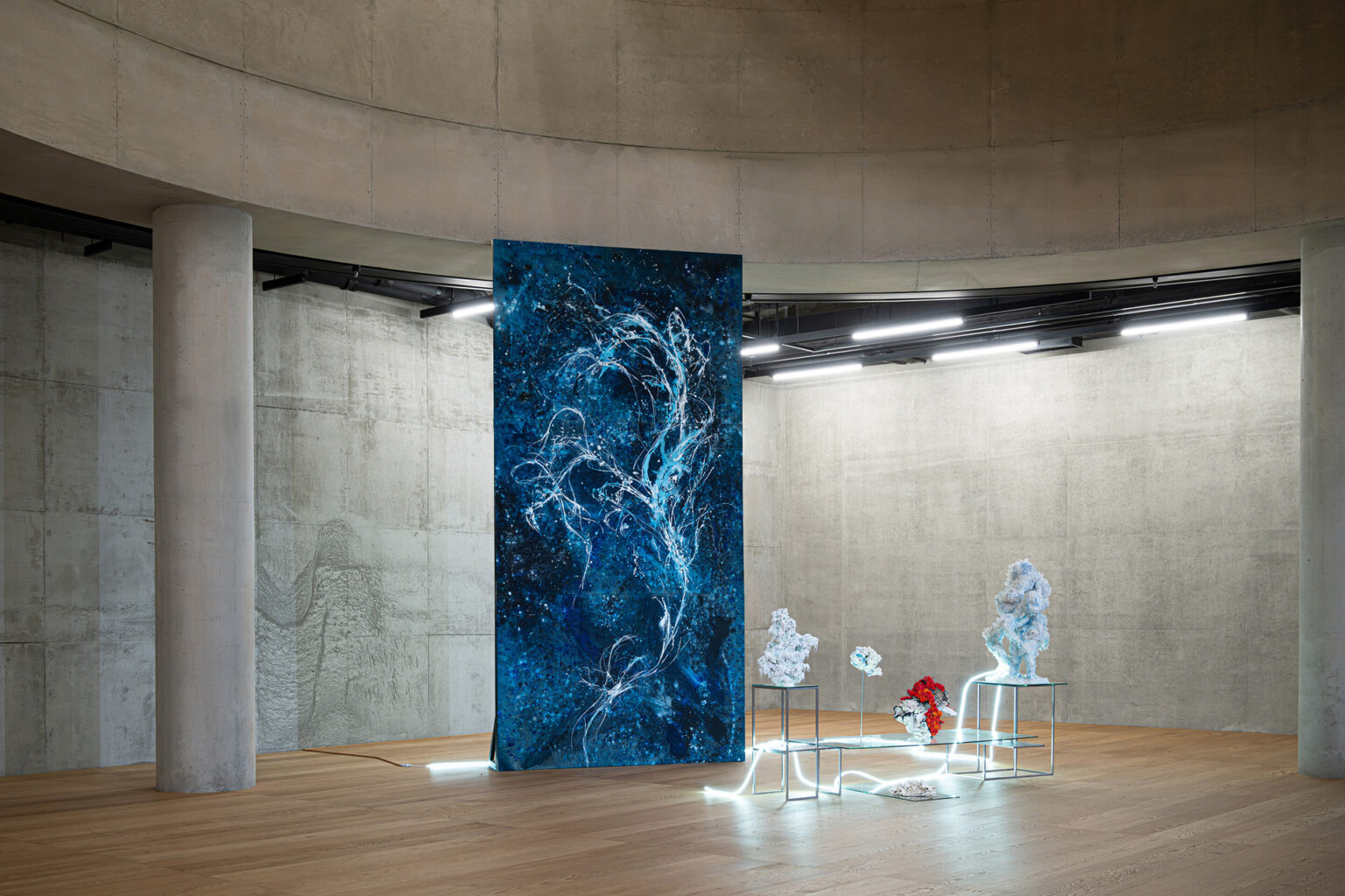 ‹Cycle›, 2023, 캔버스에 아크릴릭, 수정, 산호, 테라코타, 레진, 석고, 실리콘, 플라스틱 점토, 모래, 광물, 철사, 유리, 조명, 가변 크기